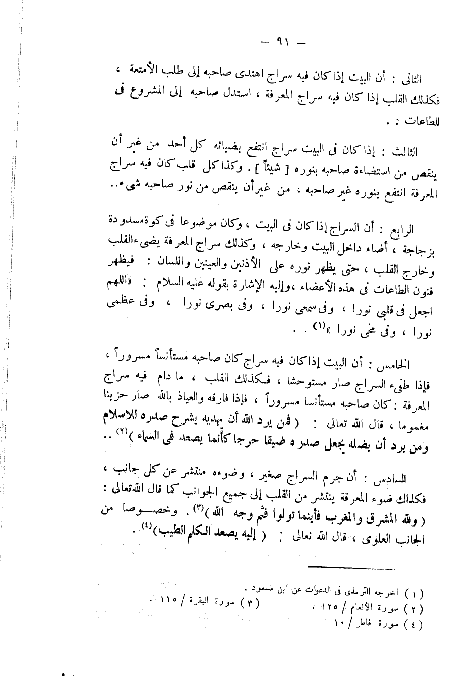 الثانى : أن البيت إذا كان فيه سراج أهتدى صاحبه إلى طلب الأمتعة ، فكذلك القلب إذا كان فيه سراج المعرفة ، استدل صاحبه إلى المشروع فى الطاعات ..