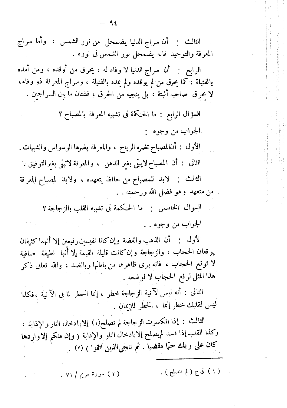 السؤال الربع : ما الحكمة فى تشبيه المعرفة بالمصباح ؟