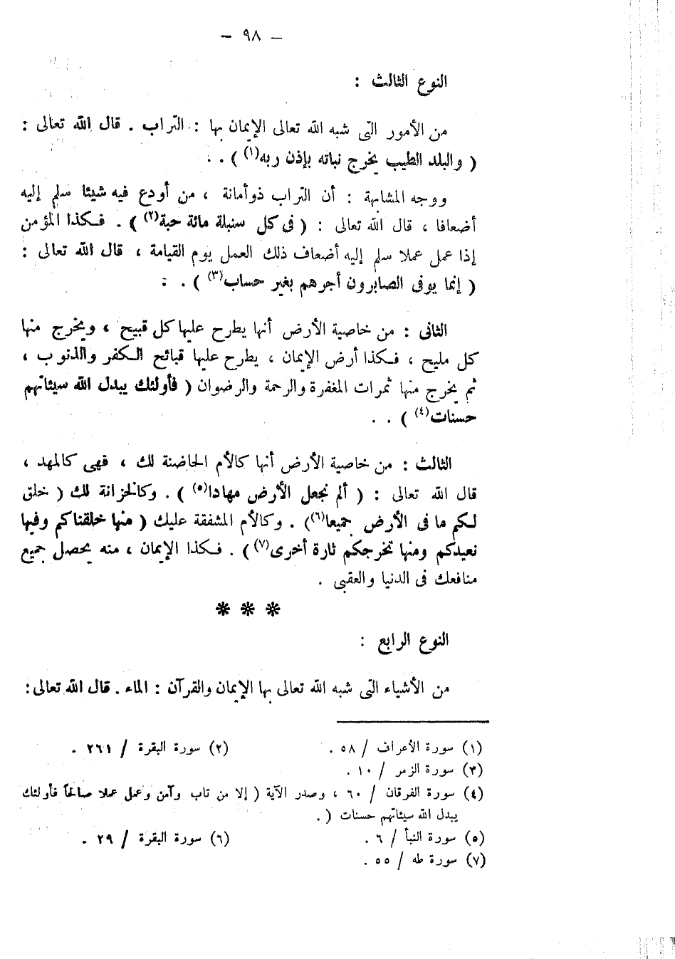 النوع الثالث : من الأمور التى شبه الله تعالى الإيمان بها : التراب قال الله تعالى : (وَالْبَلَدُ الطَّيِّبُ يَخْرُجُ نَبَاتُهُ بِإِذْنِ رَبِّهِ).