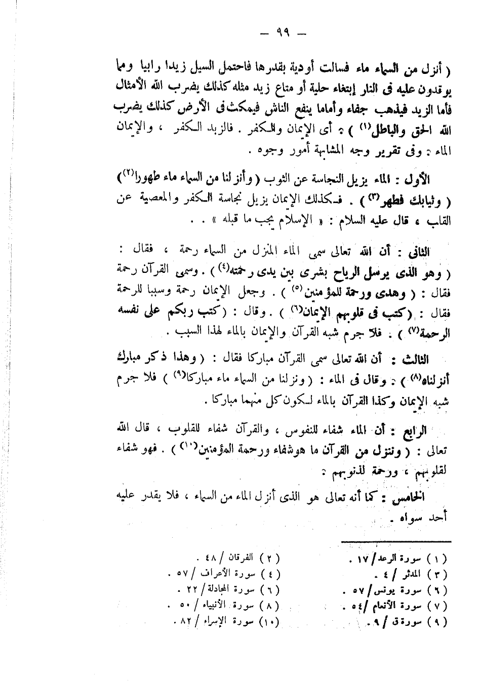 الأول : الماء يزيل النجاسة عن الثوب (وَأَنْزَلْنَا مِنَ السَّمَاءِ مَاءً طَهُورًا ). (وَثِيَابَكَ فَطَهِّرْ). فكذلك الإيمان يزيل نجاسة الكفروالمعصية عن القلب.
