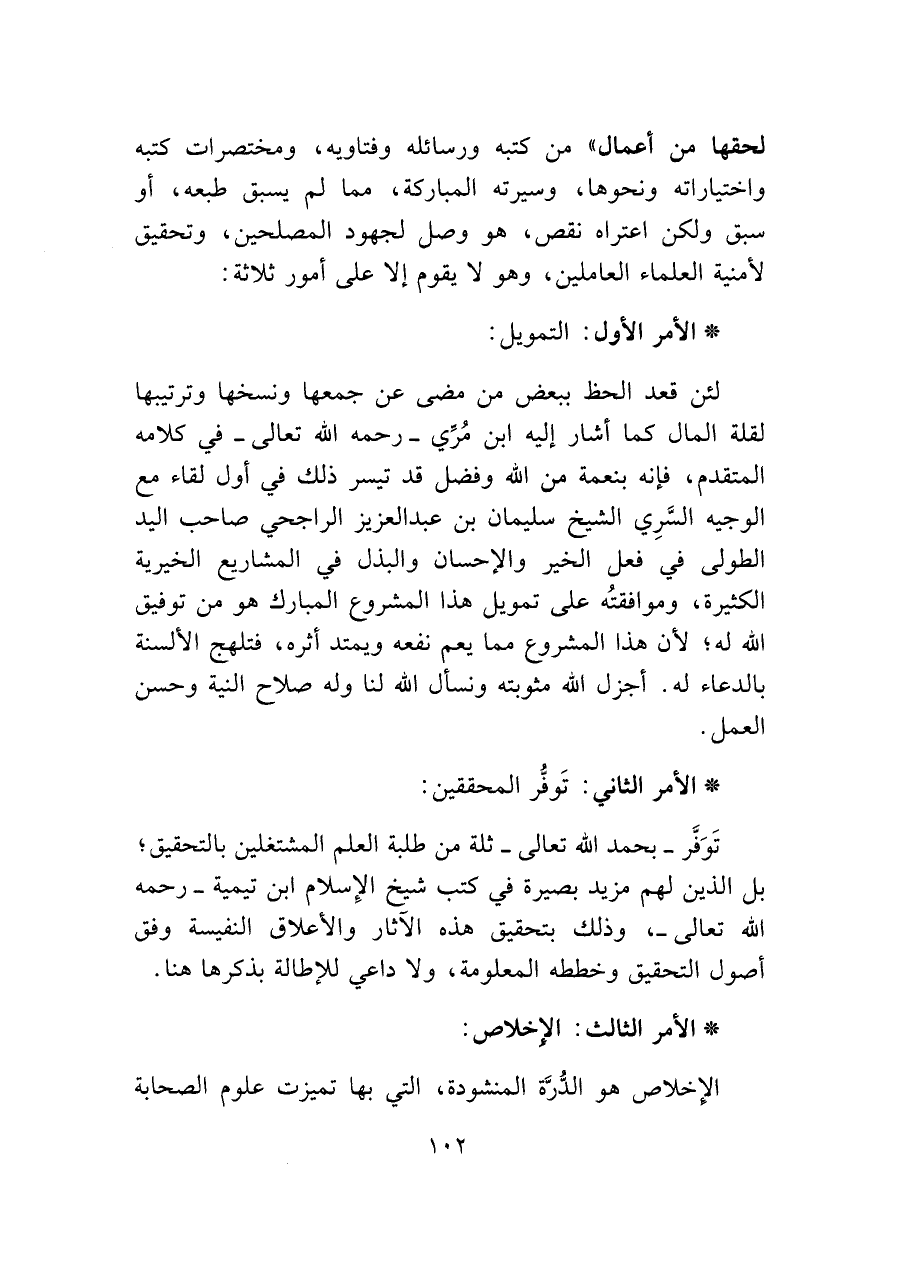 لحقها من أعمال" من كتبه ورسائله وفتاويه، ومختصرات كتبه واختياراته ونحوها، وسيرته المباركة، مما لم يسبق طبعه، أو سبق ولكن اعتراه نقص، هو وصل لجهود المصلحين، وتحقيق لأمنية العلماء العاملين، وهو لا يقوم إلا على أمور ثلاثة: