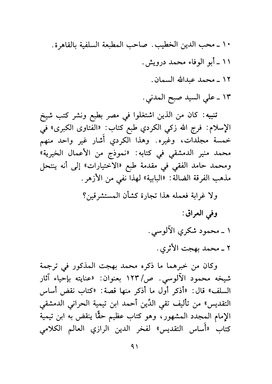تنبيه: كان من الذين اشتغلوا في مصر بطبع ونشر كتب شيخ الإِسلام: فرج الله زكي الكردي طبع كتاب: "الفتاوى الكبرى" في خمسة مجلدات، وغيره. وهذا الكردي أَشار غير واحد منهم محمَّد منير الدمشقي في كتابه: "نموذج من الأعمال الخيرية" ومحمد حامد الفقي في مقدمة طبع "الاختيارات" إلى أنه ينتحل مذهب الفرقة الضالة: "البابية" لهذا نفي من الأزهر.