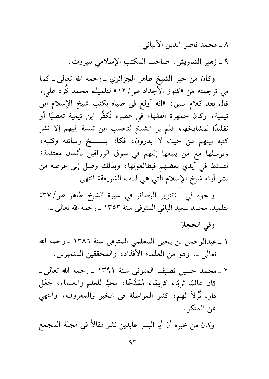 ونحوه في: "تنوير البصائر في سيرة الشيخ طاهر ص/٣٧" لتلميذه محمَّد سعيد الباني المتوفى سنة ١٣٥٣ - رحمه الله تعالى-.