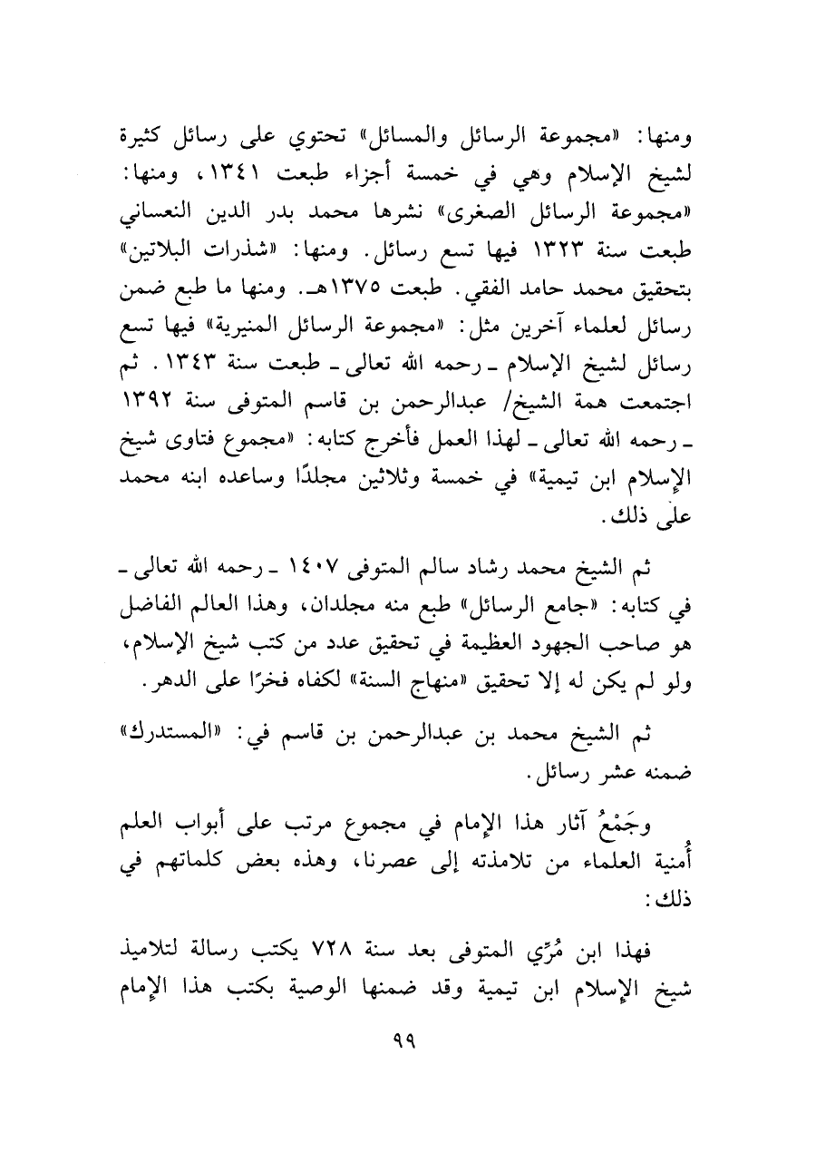 ثم الشيخ محمَّد رشاد سالم المتوفى ١٤٠٧ - رحمه الله تعالى- في كتابه: "جامع الرسائل" طبع منه مجلدان، وهذا العالم الفاضل هو صاحب الجهود العظيمة في تحقيق عدد من كتب شيخ الإِسلام، ولو لم يكن له إلا تحقيق "منهاج السنة" لكفاه فخرًا على الدهر.