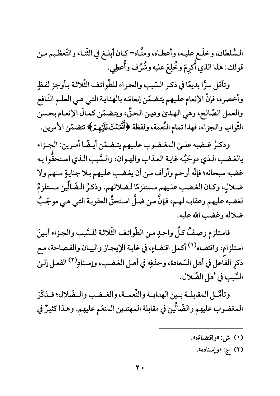 فاستلزم وصفُ كلِّ واحدٍ من الطّوائف الثّلاثة للسَّبب والجزاء أبينَ استلزامٍ، واقتضاه (¬١) أكمل اقتضاءٍ، في غاية الإيجاز والبيان والفصاحة، مع ذكرِ الفاعل في أهل السّعادة، وحذفِه في أهل الغضب، وإسنادِ (¬٢) الفعل إلى السَّبب في أهل الضّلال.