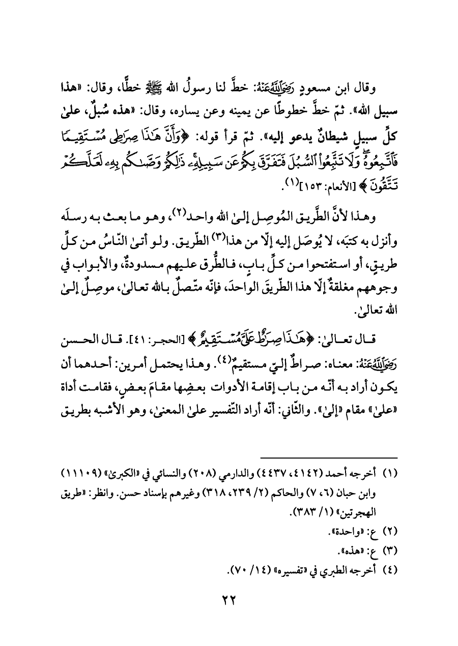 وقال ابن مسعودٍ - رضي الله عنه -: خطَّ لنا رسولُ الله - صلى الله عليه وسلم - خطًّا، وقال: "هذا سبيل الله". ثمّ خطَّ خطوطًا عن يمينه وعن يساره، وقال: "هذه سُبلٌ، على كلِّ سبيلٍ شيطانٌ يدعو إليه". ثمّ قرأ قوله: {وَأَنَّ هَذَا صِرَاطِي مُسْتَقِيمًا فَاتَّبِعُوهُ وَلَا تَتَّبِعُوا السُّبُلَ فَتَفَرَّقَ بِكُمْ عَنْ سَبِيلِهِ ذَلِكُمْ وَصَّاكُمْ بِهِ لَعَلَّكُمْ تَتَّقُونَ} [الأنعام: ١٥٣] (¬١).