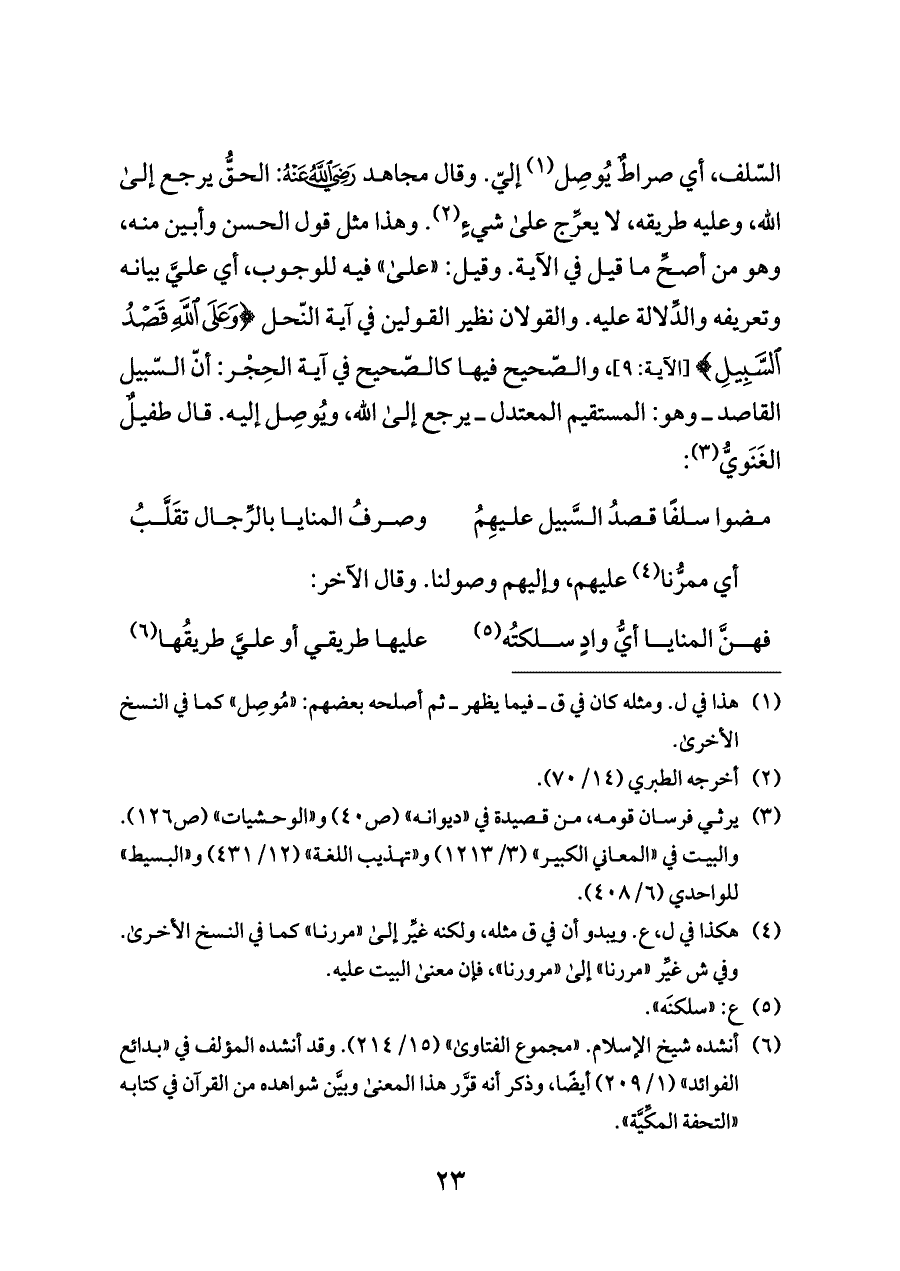 السّلف، أي صراطٌ يُوصِل (¬١) إليّ. وقال مجاهد - رضي الله عنه -: الحقُّ يرجع إلى الله، وعليه طريقه، لا يعرِّج على شيءٍ (¬٢). وهذا مثل قول الحسن وأبين منه، وهو من أصحِّ ما قيل في الآية. وقيل: "على" فيه للوجوب، أي عليَّ بيانه وتعريفه والدِّلالة عليه. والقولان نظير القولين في آية النّحل {وَعَلَى اللَّهِ قَصْدُ السَّبِيلِ} [الآية: ٩]، والصّحيح فيها كالصّحيح في آية الحِجْر: أنّ السّبيل القاصد ــ وهو: المستقيم المعتدل ــ يرجع إلى الله، ويُوصِل إليه. قال طفيلٌ الغَنَويُّ (¬٣):