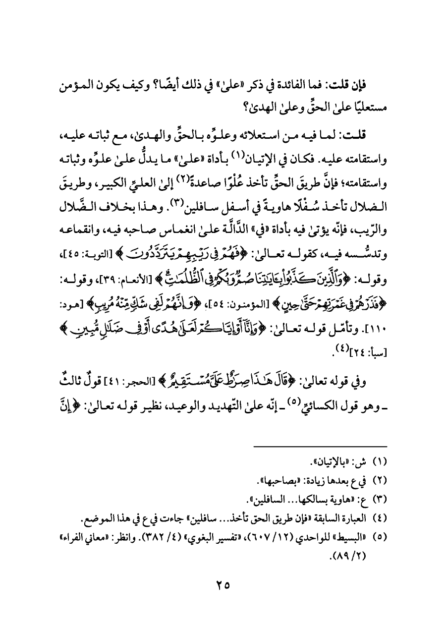 فإن قلت: فما الفائدة في ذكر "على" في ذلك أيضًا؟ وكيف يكون المؤمن مستعليًا على الحقِّ وعلى الهدى؟