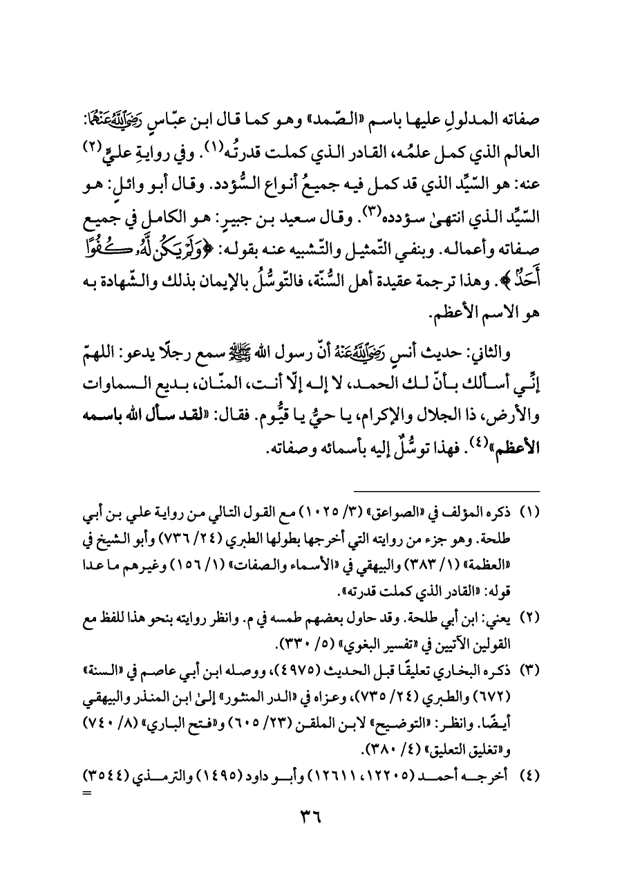 صفاته المدلولِ عليها باسم "الصّمد" وهو كما قال ابن عبّاسٍ - رضي الله عنهما -: العالم الذي كمل علمُه، القادر الذي كملت قدرتُه (¬١). وفي روايةِ عليٍّ (¬٢) عنه: هو السّيِّد الذي قد كمل فيه جميعُ أنواع السُّؤدد. وقال أبو وائلٍ: هو السّيِّد الذي انتهى سؤدده (¬٣). وقال سعيد بن جبيرٍ: هو الكامل في جميع صفاته وأعماله. وبنفي التّمثيل والتّشبيه عنه بقوله: {وَلَمْ يَكُنْ لَهُ كُفُوًا أَحَدٌ}. وهذا ترجمة عقيدة أهل السُّنّة، فالتّوسُّلُ بالإيمان بذلك والشّهادة به هو الاسم الأعظم.