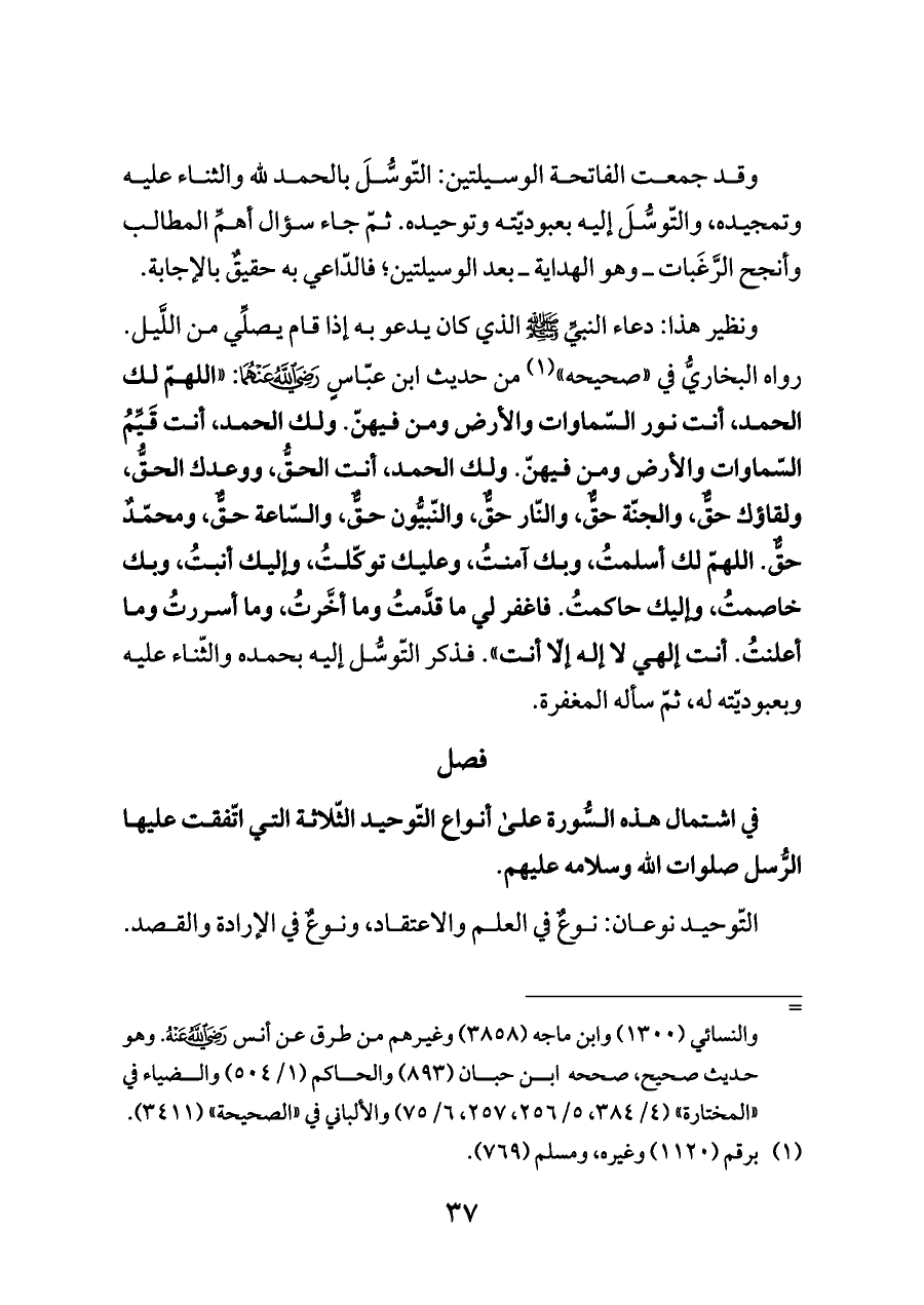 ونظير هذا: دعاء النبيِّ - صلى الله عليه وسلم - الذي كان يدعو به إذا قام يصلِّي من اللَّيل. رواه البخاريُّ في "صحيحه" (¬١) من حديث ابن عبّاسٍ - رضي الله عنهما -: "اللهمّ لك الحمد، أنت نور السّماوات والأرض ومن فيهنّ. ولك الحمد، أنت قَيِّمُ السّماوات والأرض ومن فيهنّ. ولك الحمد، أنت الحقُّ، ووعدك الحقُّ، ولقاؤك حقٌّ، والجنّة حقٌّ، والنّار حقٌّ، والنّبيُّون حقٌّ، والسّاعة حقٌّ، ومحمّدٌ حقٌّ. اللهمّ لك أسلمتُ، وبك آمنتُ، وعليك توكّلتُ، وإليك أنبتُ، وبك خاصمتُ، وإليك حاكمتُ. فاغفر لي ما قدَّمتُ وما أخَّرتُ، وما أسررتُ وما أعلنتُ. أنت إلهي لا إله إلّا أنت". فذكر التّوسُّل إليه بحمده والثّناء عليه وبعبوديّته له، ثمّ سأله المغفرة.
