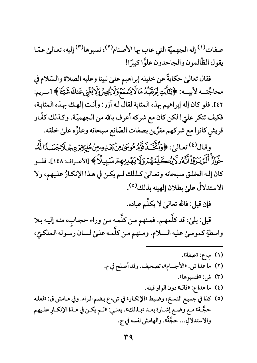 وقال (¬٤) تعالى: {وَاتَّخَذَ قَوْمُ مُوسَى مِنْ بَعْدِهِ مِنْ حُلِيِّهِمْ عِجْلًا جَسَدًا لَهُ خُوَارٌ أَلَمْ يَرَوْا أَنَّهُ لَا يُكَلِّمُهُمْ وَلَا يَهْدِيهِمْ سَبِيلًا} [الأعراف: ١٤٨]. فلو كان إله الخلق سبحانه وتعالى كذلك لم يكن في هذا الإنكارُ عليهم، ولا الاستدلالُ على بطلان إلهيته بذلك (¬٥).