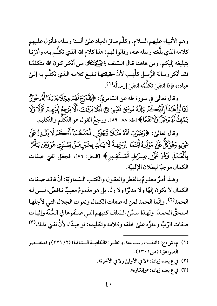 وقال تعالى: {وَضَرَبَ اللَّهُ مَثَلًا رَجُلَيْنِ أَحَدُهُمَا أَبْكَمُ لَا يَقْدِرُ عَلَى شَيْءٍ وَهُوَ كَلٌّ عَلَى مَوْلَاهُ أَيْنَمَا يُوَجِّهْهُ لَا يَأْتِ بِخَيْرٍ هَلْ يَسْتَوِي هُوَ وَمَنْ يَأْمُرُ بِالْعَدْلِ وَهُوَ عَلَى} [النحل: ٧٦]، فجعَل نفيَ صفات الكمال موجبًا لبطلان الإلهيّة.