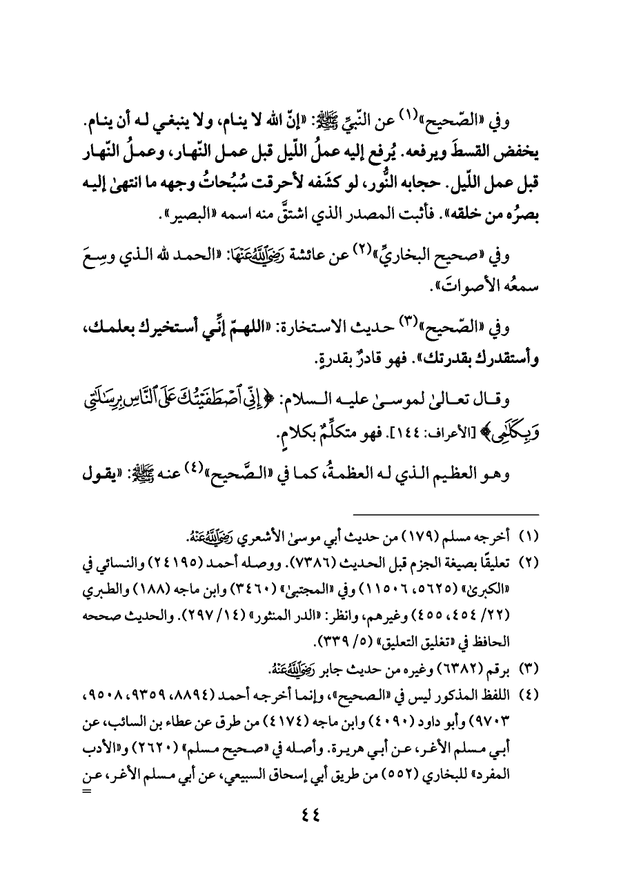 وفي "الصّحيح" (¬١) عن النّبيِّ - صلى الله عليه وسلم -: "إنّ الله لا ينام، ولا ينبغي له أن ينام. يخفض القسطَ ويرفعه. يُرفع إليه عملُ اللّيل قبل عمل النّهار، وعملُ النّهار قبل عمل اللّيل. حجابه النُّور، لو كشَفه لأحرقت سُبُحاتُ وجهه ما انتهى إليه بصرُه من خلقه". فأثبت المصدر الذي اشتقَّ منه اسمه "البصير".