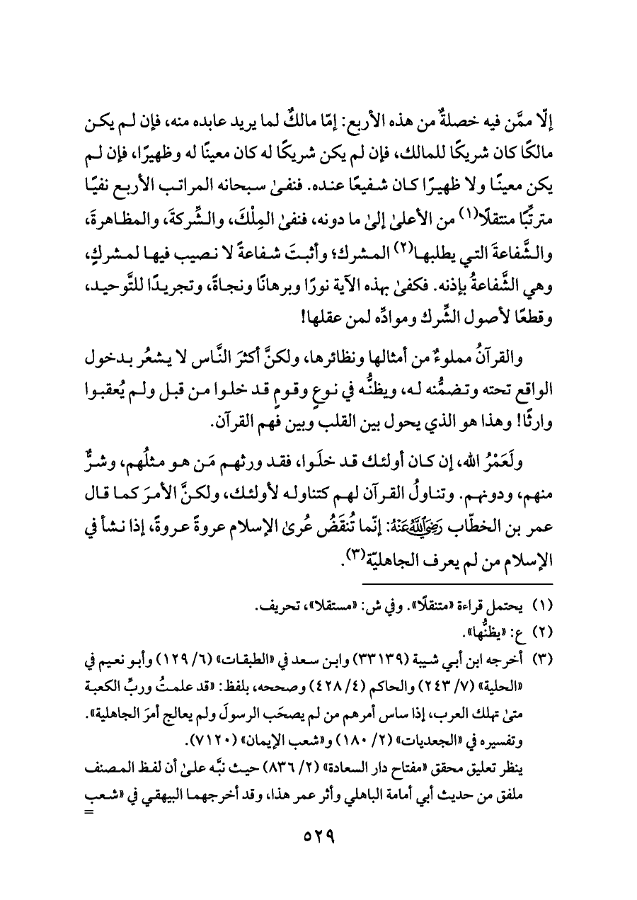 ولَعَمْرُ الله، إن كان أولئك قد خلَوا، فقد ورثهم مَن هو مثلُهم، وشرٌّ منهم، ودونهم. وتناولُ القرآن لهم كتناوله لأولئك، ولكنَّ الأمرَ كما قال عمر بن الخطّاب - رضي الله عنه -: إنّما تُنقَضُ عُرى الإسلام عروةً عروةً، إذا نشأ في الإسلام من لم يعرف الجاهليّة (¬٣).