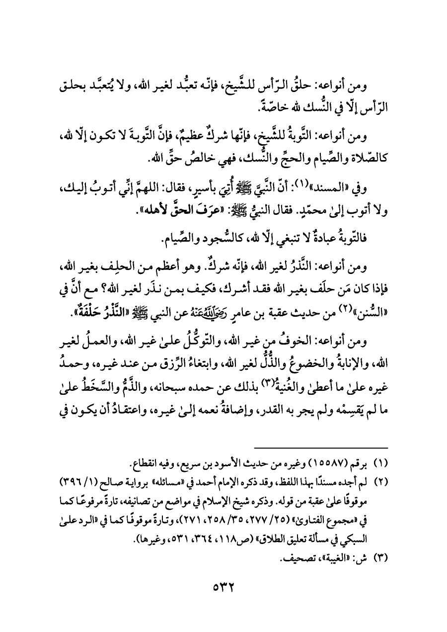 ومن أنواعه: التَّوبةُ للشَّيخ، فإنّها شركٌ عظيمٌ، فإنَّ التَّوبةَ لا تكون إلّا لله، كالصّلاة والصِّيام والحجِّ والنُّسك، فهي خالصُ حقِّ الله.
