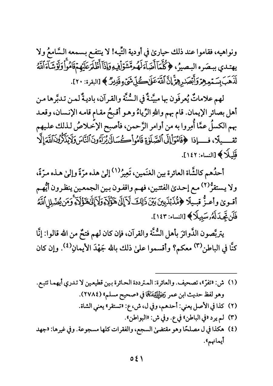 أحدُهم كالشَّاة العائرة بين الغنَمين، تَعِيرُ (¬١) إلى هذه مرّةً وإلى هذه مرّةً، ولا يستقرُّ (¬٢) مع إحدى الفئتين، فهم واقفون بين الجمعين ينظرون أيُّهم أقوى وأعزُّ قبيلًا {مُذَبْذَبِينَ بَيْنَ ذَلِكَ لَا إِلَى هَؤُلَاءِ وَلَا إِلَى هَؤُلَاءِ وَمَنْ يُضْلِلِ اللَّهُ فَلَنْ تَجِدَ لَهُ سَبِيلًا} [النساء: ١٤٣].