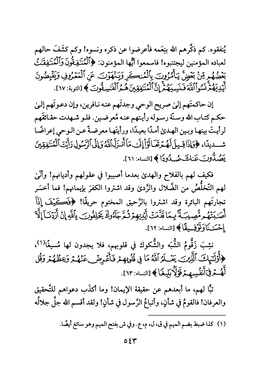إن حاكمتَهم إلى صريح الوحي وجدتَهم عنه نافرين، وإن دعوتَهم إلى حكم كتاب الله وسنّة رسوله رأيتهم عنه مُعرضين. فلو شهدت حقائقَهم لرأيتَ بينها وبين الهدى أمدًا بعيدًا، ورأيتَها معرضةً عن الوحي إعراضًا شديدًا، {قِيلَ لَهُمْ تَعَالَوْا إِلَى مَا أَنْزَلَ اللَّهُ وَإِلَى الرَّسُولِ رَأَيْتَ الْمُنَافِقِينَ يَصُدُّونَ عَنْكَ صُدُودًا (٦١)} [النساء: ٦١].