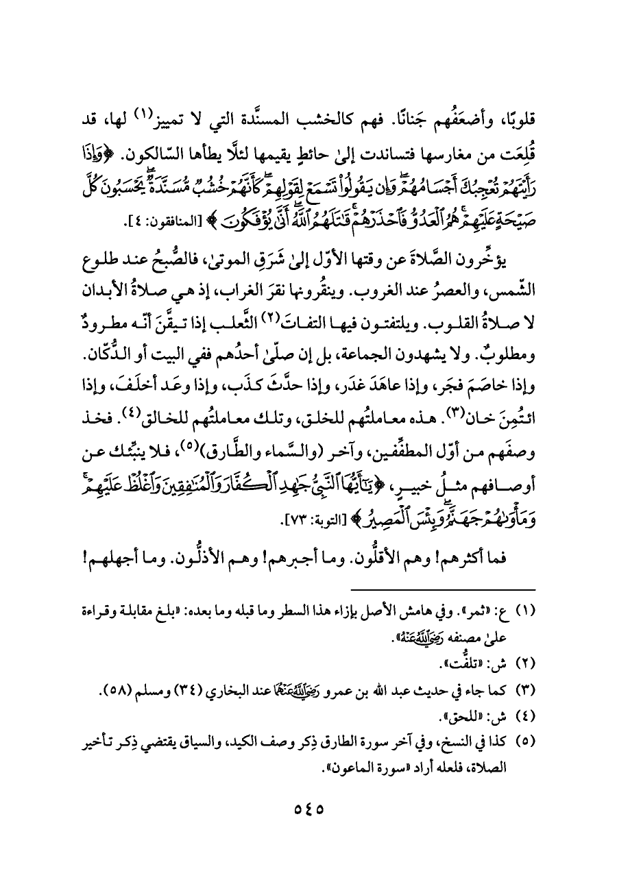يؤخِّرون الصَّلاةَ عن وقتها الأوّل إلى شَرَقِ الموتى، فالصُّبحُ عند طلوع الشّمس، والعصرُ عند الغروب. وينقُرونها نقرَ الغراب، إذ هي صلاةُ الأبدان لا صلاةُ القلوب. ويلتفتون فيها التفاتَ (¬٢) الثَّعلب إذا تيقَّنَ أنّه مطرودٌ ومطلوبٌ. ولا يشهدون الجماعة، بل إن صلّى أحدُهم ففي البيت أو الدُّكّان. وإذا خاصَمَ فجَر، وإذا عاهَدَ غدَر، وإذا حدَّثَ كذَب، وإذا وعَد أخلَفَ، وإذا ائتُمِنَ خان (¬٣). هذه معاملتُهم للخلق، وتلك معاملتُهم للخالق (¬٤). فخذ وصفَهم من أوّل المطفِّفين، وآخر (والسَّماء والطَّارق) (¬٥)، فلا ينبِّئك عن أوصافهم مثلُ خبيرٍ، {يَاأَيُّهَا النَّبِيُّ جَاهِدِ الْكُفَّارَ وَالْمُنَافِقِينَ وَاغْلُظْ عَلَيْهِمْ وَمَأْوَاهُمْ جَهَنَّمُ وَبِئْسَ الْمَصِيرُ} [التوبة: ٧٣].