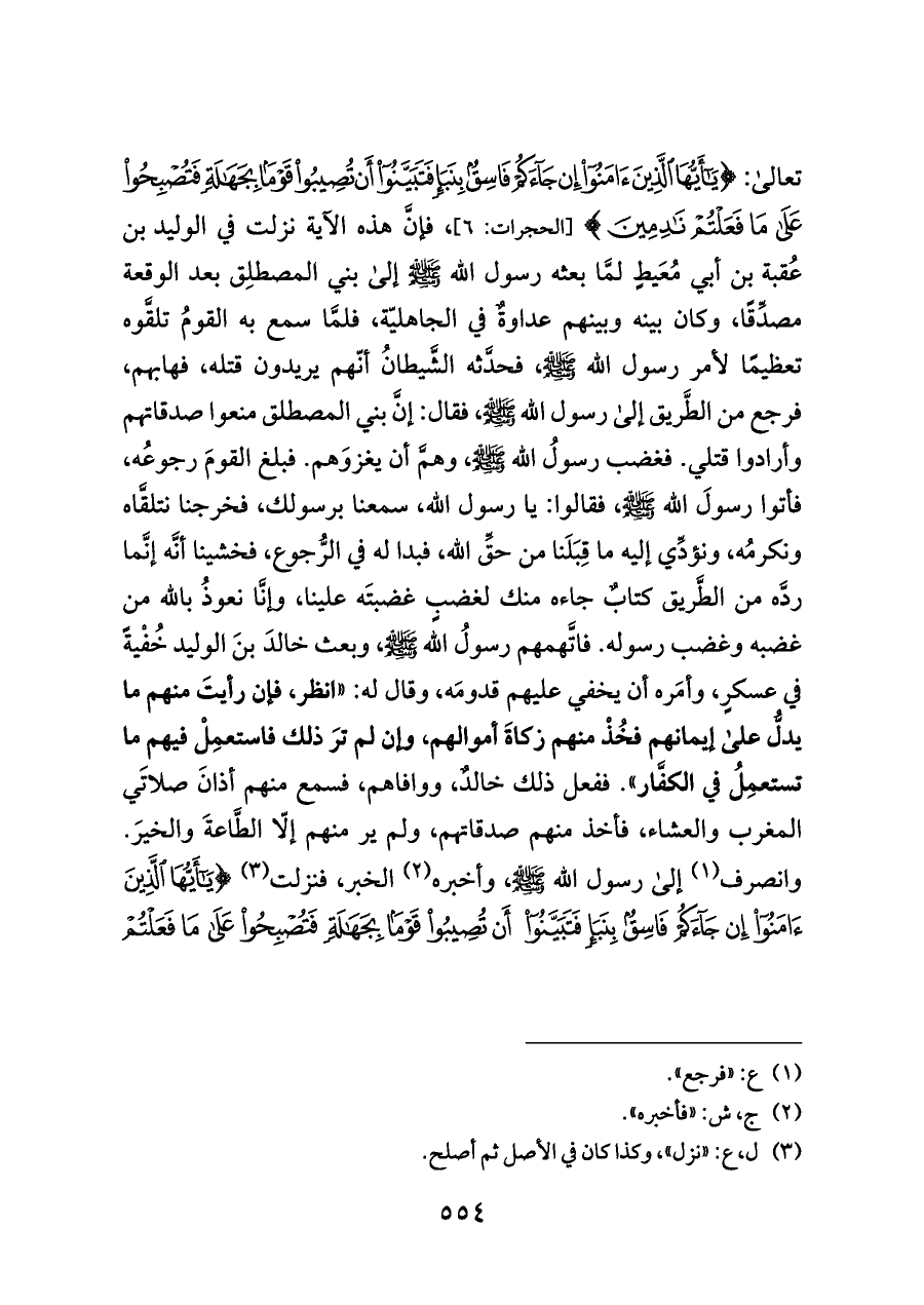 تعالى: {يَاأَيُّهَا الَّذِينَ آمَنُوا إِنْ جَاءَكُمْ فَاسِقٌ بِنَبَإٍ فَتَبَيَّنُوا أَنْ تُصِيبُوا قَوْمًا بِجَهَالَةٍ فَتُصْبِحُوا عَلَى مَا فَعَلْتُمْ نَادِمِينَ} [الحجرات: ٦]، فإنَّ هذه الآية نزلت في الوليد بن عُقبة بن أبي مُعَيطٍ لمَّا بعثه رسول الله - صلى الله عليه وسلم - إلى بني المصطلِق بعد الوقعة مصدِّقًا، وكان بينه وبينهم عداوةٌ في الجاهليّة، فلمَّا سمع به القومُ تلقَّوه تعظيمًا لأمر رسول الله - صلى الله عليه وسلم -، فحدَّثه الشَّيطانُ أنّهم يريدون قتله، فهابهم، فرجع من الطَّريق إلى رسول الله - صلى الله عليه وسلم -، فقال: إنَّ بني المصطلق منعوا صدقاتهم وأرادوا قتلي. فغضب رسولُ الله - صلى الله عليه وسلم -، وهمَّ أن يغزوَهم. فبلغ القومَ رجوعُه، فأتوا رسولَ الله - صلى الله عليه وسلم -، فقالوا: يا رسول الله، سمعنا برسولك، فخرجنا نتلقَّاه ونكرمُه، ونؤدِّي إليه ما قِبَلَنا من حقِّ الله، فبدا له في الرُّجوع، فخشينا أنَّه إنَّما ردَّه من الطَّريق كتابٌ جاءه منك لغضبٍ غضبتَه علينا، وإنَّا نعوذُ بالله من غضبه وغضب رسوله. فاتَّهمهم رسولُ الله - صلى الله عليه وسلم -، وبعث خالدَ بنَ الوليد خُفْيةً في عسكرٍ، وأمَره أن يخفي عليهم قدومَه، وقال له: "انظر، فإن رأيتَ منهم ما يدلُّ على إيمانهم فخُذْ منهم زكاةَ أموالهم، وإن لم ترَ ذلك فاستعمِلْ فيهم ما تستعمِلُ في الكفَّار". ففعل ذلك خالدٌ، ووافاهم، فسمع منهم أذانَ صلاتَي المغرب والعشاء، فأخذ منهم صدقاتهم، ولم ير منهم إلّا الطَّاعةَ والخيرَ. وانصرف (¬١) إلى رسول الله - صلى الله عليه وسلم -، وأخبره (¬٢)