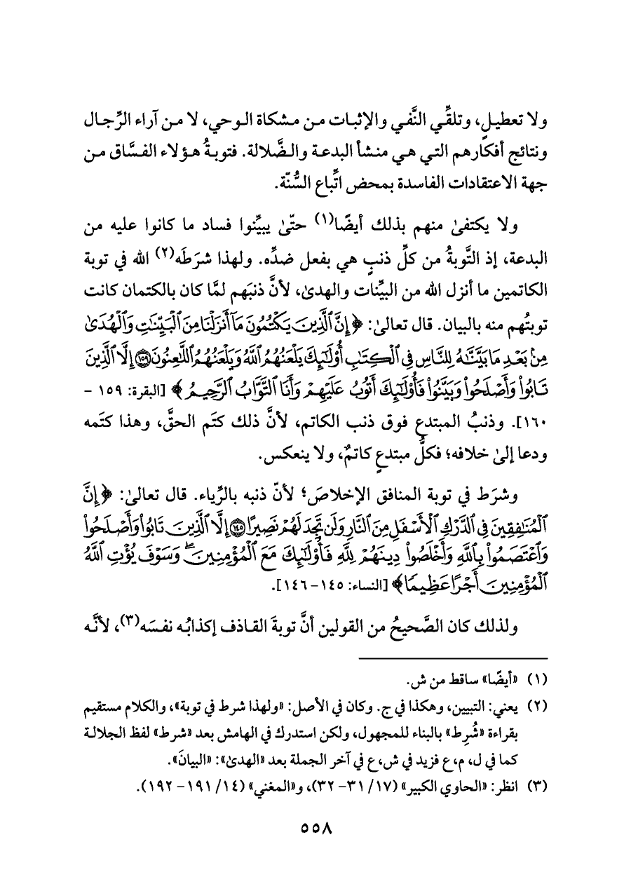 ولا يكتفى منهم بذلك أيضًا (¬١) حتّى يبيِّنوا فساد ما كانوا عليه من البدعة، إذ التَّوبةُ من كلِّ ذنبٍ هي بفعل ضدِّه. ولهذا شرَطَه (¬٢) الله في توبة الكاتمين ما أنزل الله من البيِّنات والهدى، لأنَّ ذنبَهم لمَّا كان بالكتمان كانت توبتُهم منه بالبيان. قال تعالى: {إِنَّ الَّذِينَ يَكْتُمُونَ مَا أَنْزَلْنَا مِنَ الْبَيِّنَاتِ وَالْهُدَى مِنْ بَعْدِ مَا بَيَّنَّاهُ لِلنَّاسِ فِي الْكِتَابِ أُولَئِكَ يَلْعَنُهُمُ اللَّهُ وَيَلْعَنُهُمُ اللَّاعِنُونَ (١٥٩) إِلَّا الَّذِينَ تَابُوا وَأَصْلَحُوا وَبَيَّنُوا فَأُولَئِكَ أَتُوبُ عَلَيْهِمْ وَأَنَا} [البقرة: ١٥٩ - ١٦٠]. وذنبُ المبتدع فوق ذنب الكاتم، لأنَّ ذلك كتَم الحقَّ، وهذا كتَمه ودعا إلى خلافه؛ فكلُّ مبتدعٍ كاتمٌ، ولا ينعكس.