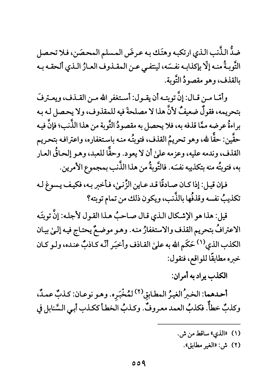 وأمّا من قال: إنَّ توبته أن يقول: أستغفر الله من القذف، ويعترفَ بتحريمه، فقولٌ ضعيفٌ لأنَّ هذا لا مصلحةَ فيه للمقذوف، ولا يحصل له به براءةُ عرضه ممَّا قذفه به، فلا يحصل به مقصودُ التَّوبة من هذا الذَّنب؛ فإنَّ فيه حقَّين: حقًّا لله، وهو تحريمُ القذف، فتوبتُه منه باستغفاره، واعترافه بتحريم القذف، وندمه عليه، وعزمه على أن لا يعود. وحقًّا للعبد، وهو إلحاقُ العار به، فتوبتُه منه بتكذيبه نفسَه. فالتَّوبةُ من هذا الذَّنب بمجموع الأمرين.