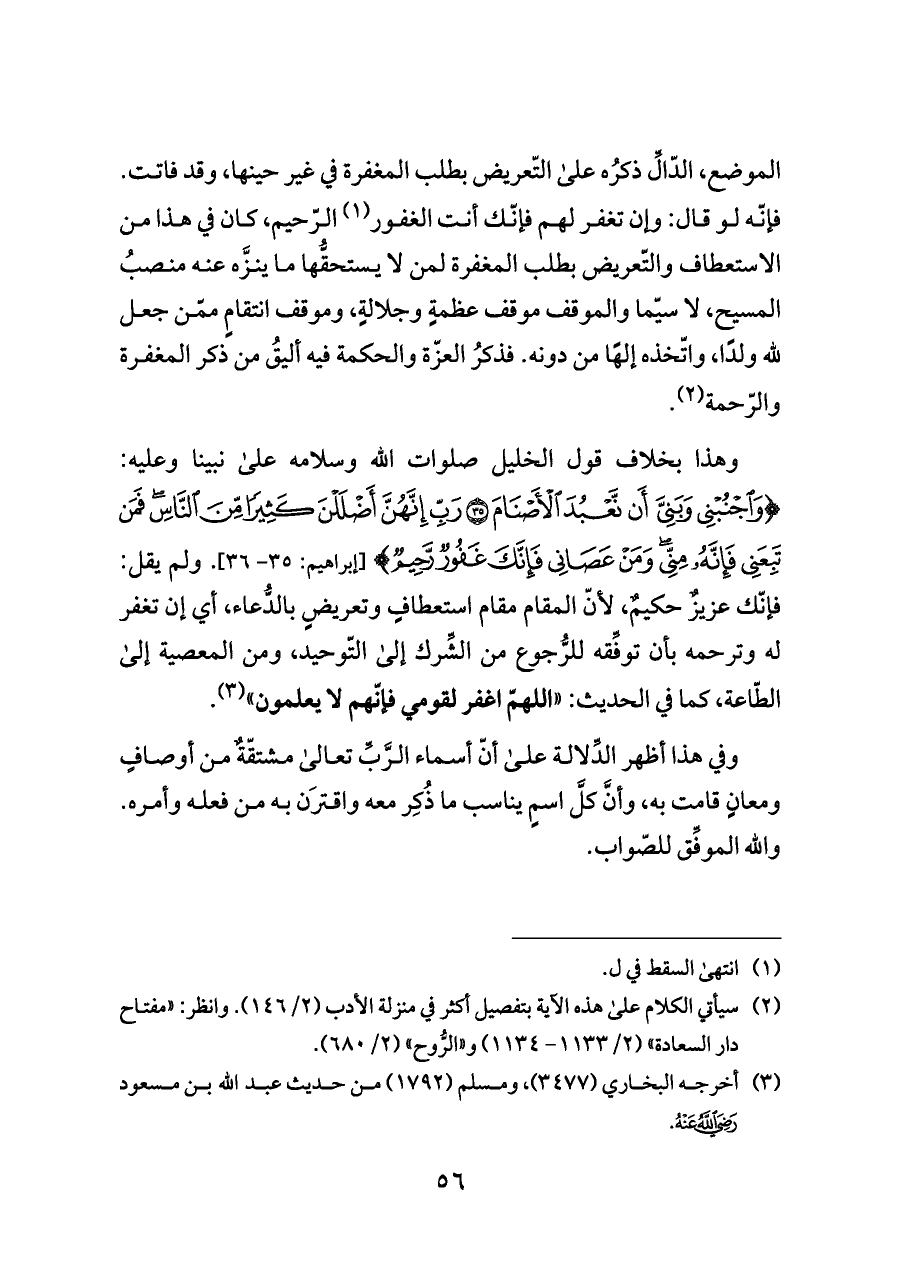 وهذا بخلاف قول الخليل صلوات الله وسلامه على نبينا وعليه: {وَاجْنُبْنِي وَبَنِيَّ أَنْ نَعْبُدَ الْأَصْنَامَ (٣٥) رَبِّ إِنَّهُنَّ أَضْلَلْنَ كَثِيرًا مِنَ النَّاسِ فَمَنْ تَبِعَنِي فَإِنَّهُ مِنِّي وَمَنْ عَصَانِي فَإِنَّكَ غَفُورٌ رَحِيمٌ} [إبراهيم: ٣٥ - ٣٦]. ولم يقل: فإنّك عزيزٌ حكيمٌ، لأنّ المقام مقام استعطافٍ وتعريضٍ بالدُّعاء، أي إن تغفر له وترحمه بأن توفِّقه للرُّجوع من الشِّرك إلى التّوحيد، ومن المعصية إلى الطّاعة، كما في الحديث: "اللهمّ اغفر لقومي فإنّهم لا يعلمون" (¬٣).