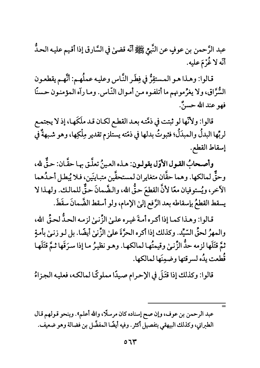 عبد الرَّحمن بن عوفٍ عن النَّبيِّ - صلى الله عليه وسلم - أنّه قضى في السَّارق إذا أقيم عليه الحدُّ أنّه لا غُرْمَ عليه.