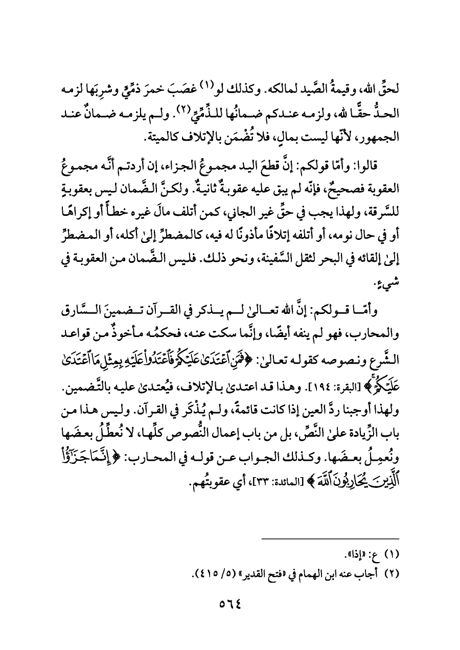 وأمّا قولكم: إنَّ الله تعالى لم يذكر في القرآن تضمينَ السَّارق والمحارب، فهو لم ينفه أيضًا، وإنَّما سكت عنه، فحكمُه مأخوذٌ من قواعد الشَّرع ونصوصه كقوله تعالى: {فَمَنِ اعْتَدَى عَلَيْكُمْ فَاعْتَدُوا عَلَيْهِ بِمِثْلِ مَا اعْتَدَى عَلَيْكُمْ} [البقرة: ١٩٤]. وهذا قد اعتدى بالإتلاف، فيُعتدى عليه بالتَّضمين. ولهذا أوجبنا ردَّ العين إذا كانت قائمةً، ولم يُذْكَر في القرآن. وليس هذا من باب الزِّيادة على النَّصِّ، بل من باب إعمال النُّصوص كلِّها، لا نُعطِّلُ بعضَها ونُعمِلُ بعضَها. وكذلك الجواب عن قوله في المحارب: {إِنَّمَا جَزَاءُ الَّذِينَ يُحَارِبُونَ اللَّهَ} [المائدة: ٣٣]، أي عقوبتُهم.