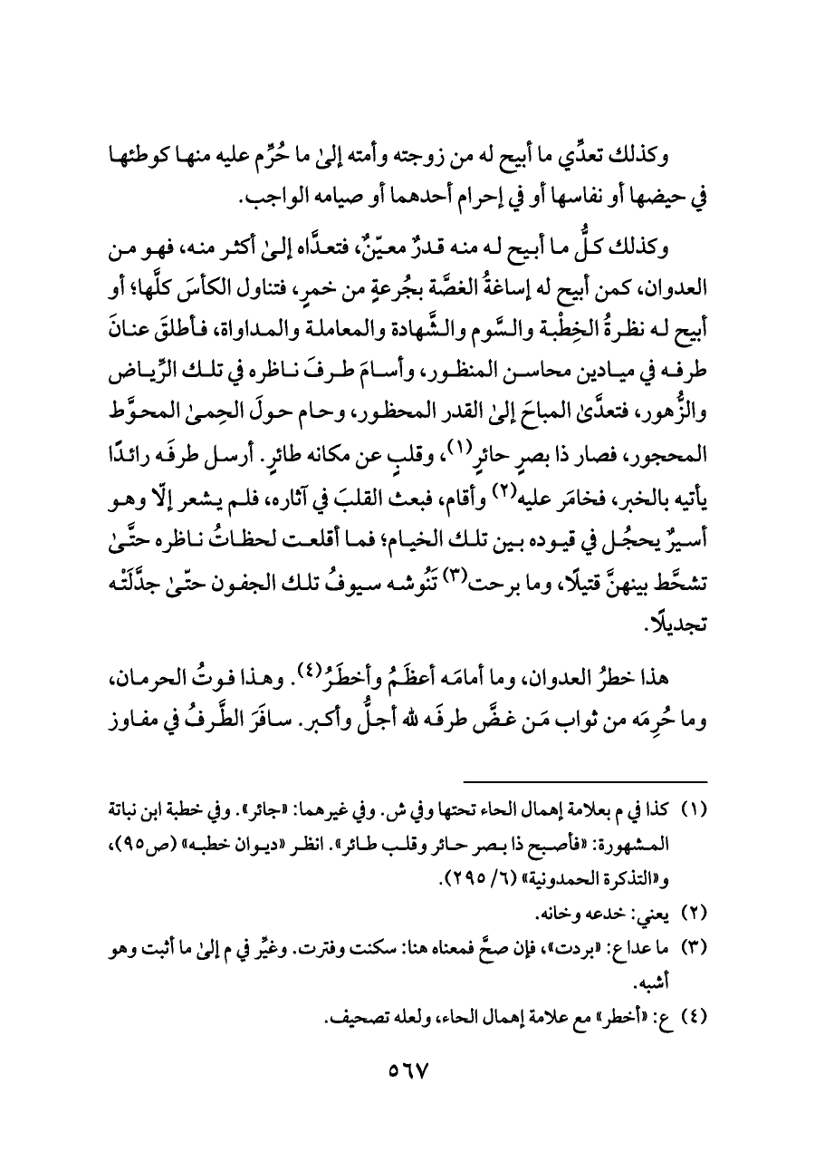 وكذلك كلُّ ما أبيح له منه قدرٌ معيّنٌ، فتعدَّاه إلى أكثر منه، فهو من العدوان، كمن أبيح له إساغةُ الغصَّة بجُرعةٍ من خمرٍ، فتناول الكأسَ كلَّها؛ أو أبيح له نظرةُ الخِطْبة والسَّوم والشَّهادة والمعاملة والمداواة، فأطلقَ عنانَ طرفه في ميادين محاسن المنظور، وأسامَ طرفَ ناظره في تلك الرِّياض والزُّهور، فتعدَّى المباحَ إلى القدر المحظور، وحام حولَ الحِمى المحوَّط المحجور، فصار ذا بصرٍ حائرٍ (¬١)، وقلبٍ عن مكانه طائرٍ. أرسل طرفَه رائدًا يأتيه بالخبر، فخامَر عليه (¬٢) وأقام، فبعث القلبَ في آثاره، فلم يشعر إلّا وهو أسيرٌ يحجُل في قيوده بين تلك الخيام؛ فما أقلعت لحظاتُ ناظره حتَّى تشحَّط بينهنَّ قتيلًا، وما برحت (¬٣) تَنُوشه سيوفُ تلك الجفون حتّى جدَّلَتْه تجديلًا.