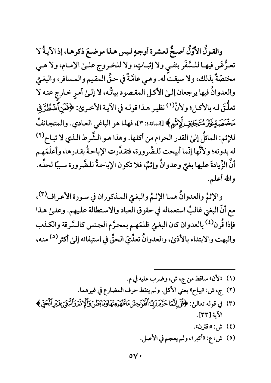 والقولُ الأَوّلُ أصحُّ لعشرة أوجهٍ ليس هذا موضعَ ذكرها، إذ الآيةُ لا تعرُّضَ فيها للسَّفَر بنفيٍ ولا إثباتٍ، ولا للخروج على الإمام، ولا هي مختصّةٌ بذلك، ولا سيقت له. وهي عامَّةٌ في حقِّ المقيم والمسافر، والبغيُ والعدوانُ فيها يرجعان إلى الأكل المقصود بيانُه، لا إلى أمرٍ خارجٍ عنه لا تعلُّقَ له بالأكل؛ ولأنّ (¬١) نظير هذا قوله في الآية الأخرى: {فَمَنِ اضْطُرَّ فِي مَخْمَصَةٍ غَيْرَ مُتَجَانِفٍ لِإِثْمٍ} [المائدة: ٣]، فهذا هو الباغي العادي. والمتجانفُ للإثم: المائلُ إلى القدر الحرام من أكلها. وهذا هو الشَّرط الذي لا تباح (¬٢) له بدونه؛ ولأنَّها إنّما أبيحت للضَّرورة، فتقدَّرت الإباحةُ بقدرها، وأعلَمَهم أنَّ الزِّيادةَ عليها بغيٌ وعدوانٌ وإثمٌ، فلا تكون الإباحةُ للضَّرورة سببًا لحلِّه. والله أعلم.