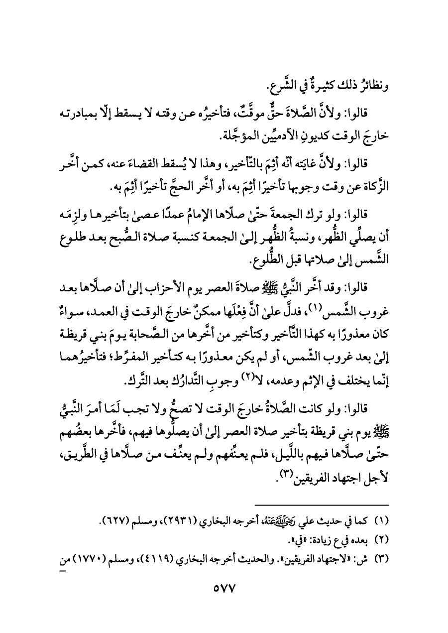 قالوا: ولو كانت الصَّلاةُ خارجَ الوقت لا تصحُّ ولا تجب لَمَا أمرَ النَّبيُّ - صلى الله عليه وسلم - يوم بني قريظة بتأخير صلاة العصر إلى أن يصلُّوها فيهم، فأخَّرها بعضُهم حتّى صلَّاها فيهم باللَّيل، فلم يعنِّفهم ولم يعنِّف من صلَّاها في الطَّريق، لأجل اجتهاد الفريقين (¬٣).