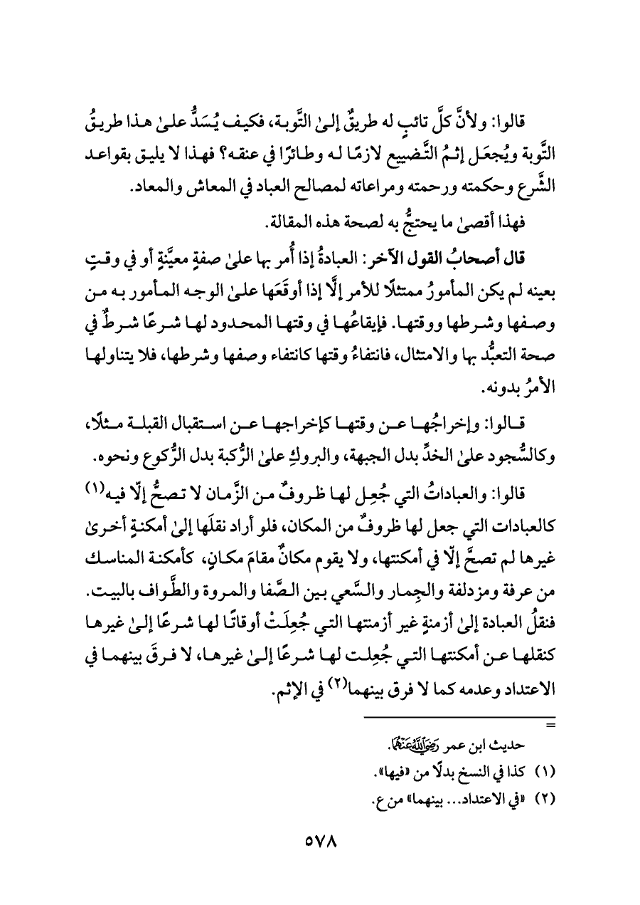 قالوا: والعباداتُ التي جُعِل لها ظروفٌ من الزَّمان لا تصحُّ إلّا فيه (¬١) كالعبادات التي جعل لها ظروفٌ من المكان، فلو أراد نقلَها إلى أمكنةٍ أخرى غيرها لم تصحَّ إلّا في أمكنتها، ولا يقوم مكانٌ مقامَ مكانٍ، كأمكنة المناسك من عرفة ومزدلفة والجِمار والسَّعي بين الصَّفا والمروة والطَّواف بالبيت. فنقلُ العبادة إلى أزمنةٍ غير أزمنتها التي جُعِلَتْ أوقاتًا لها شرعًا إلى غيرها كنقلها عن أمكنتها التي جُعِلت لها شرعًا إلى غيرها، لا فرقَ بينهما في الاعتداد وعدمه كما لا فرق بينهما (¬٢) في الإثم.