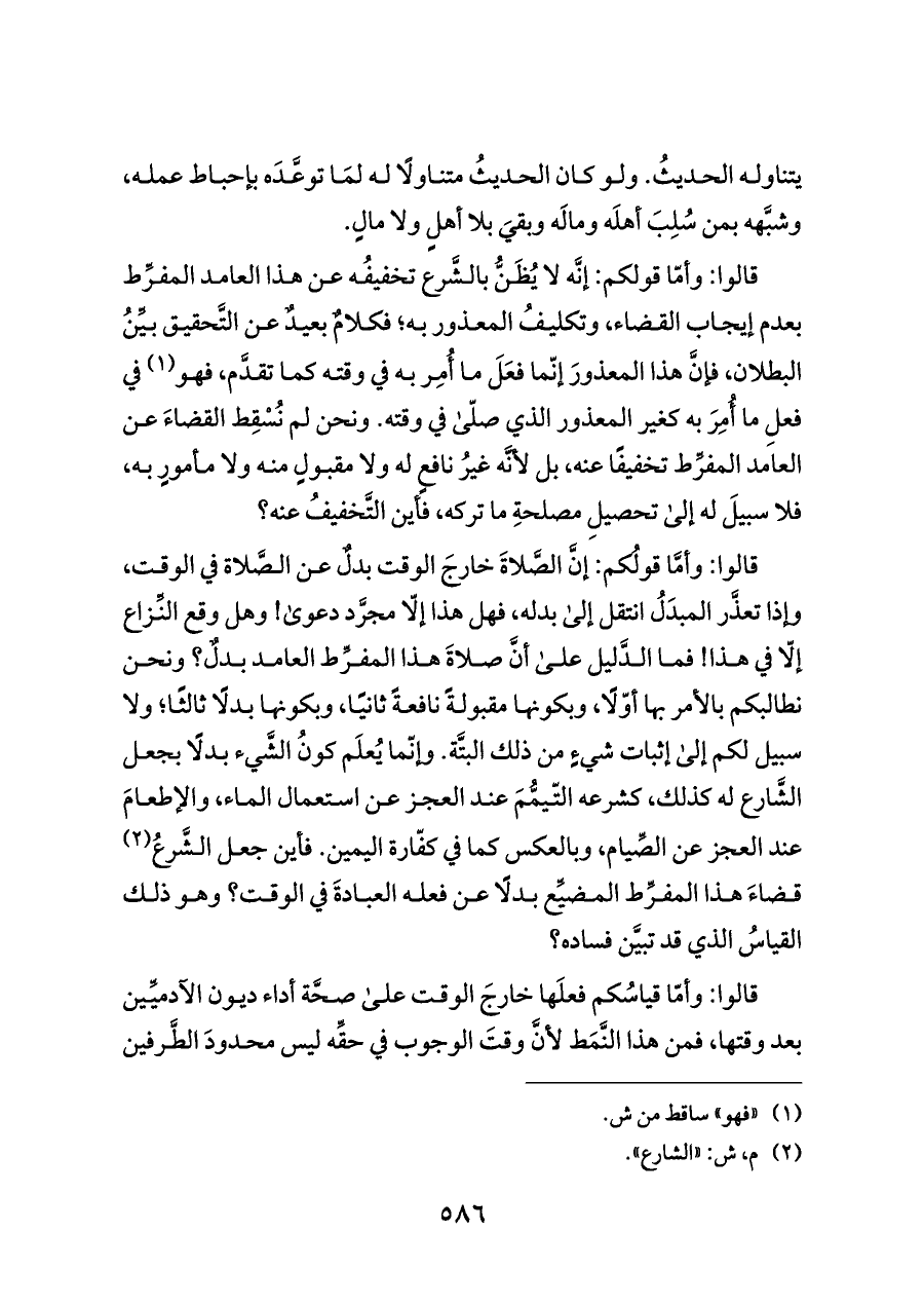 قالوا: وأمّا قولكم: إنَّه لا يُظَنُّ بالشَّرع تخفيفُه عن هذا العامد المفرِّط بعدم إيجاب القضاء، وتكليفُ المعذور به؛ فكلامٌ بعيدٌ عن التَّحقيق بيِّنُ البطلان، فإنَّ هذا المعذورَ إنّما فعَلَ ما أُمِر به في وقته كما تقدَّم، فهو (¬١) في فعلِ ما أُمِرَ به كغير المعذور الذي صلّى في وقته. ونحن لم نُسْقِط القضاءَ عن العامد المفرِّط تخفيفًا عنه، بل لأنَّه غيرُ نافعٍ له ولا مقبولٍ منه ولا مأمورٍ به، فلا سبيلَ له إلى تحصيلِ مصلحةِ ما تركه، فأين التَّخفيفُ عنه؟