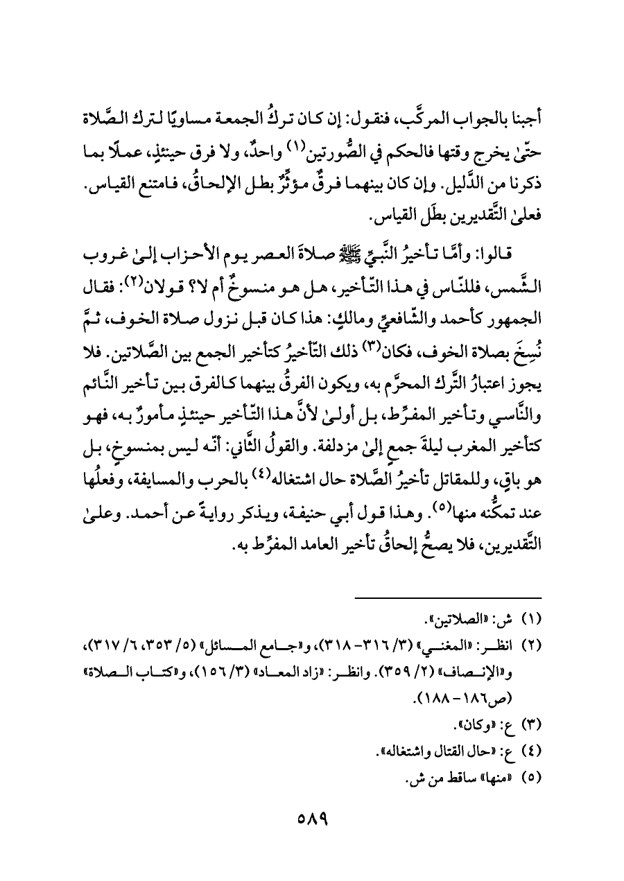قالوا: وأمَّا تأخيرُ النَّبيِّ - صلى الله عليه وسلم - صلاةَ العصر يوم الأحزاب إلى غروب الشَّمس، فللنّاس في هذا التّأخير، هل هو منسوخٌ أم لا؟ قولان (¬٢): فقال الجمهور كأحمد والشّافعيِّ ومالكٍ: هذا كان قبل نزول صلاة الخوف، ثمَّ نُسِخَ بصلاة الخوف، فكان (¬٣) ذلك التّأخيرُ كتأخير الجمع بين الصَّلاتين. فلا يجوز اعتبارُ التَّرك المحرَّم به، ويكون الفرقُ بينهما كالفرق بين تأخير النَّائم والنَّاسي وتأخير المفرِّط، بل أولى لأنَّ هذا التّأخير حينئذٍ مأمورٌ به، فهو كتأخير المغرب ليلةَ جمعٍ إلى مزدلفة. والقولُ الثَّاني: أنّه ليس بمنسوخٍ، بل هو باقٍ، وللمقاتل تأخيرُ الصَّلاة حال اشتغاله (¬٤) بالحرب والمسايفة، وفعلُها عند تمكُّنه منها (¬٥). وهذا قول أبي حنيفة، ويذكر روايةً عن أحمد. وعلى التَّقديرين، فلا يصحُّ إلحاقُ تأخير العامد المفرِّط به.
