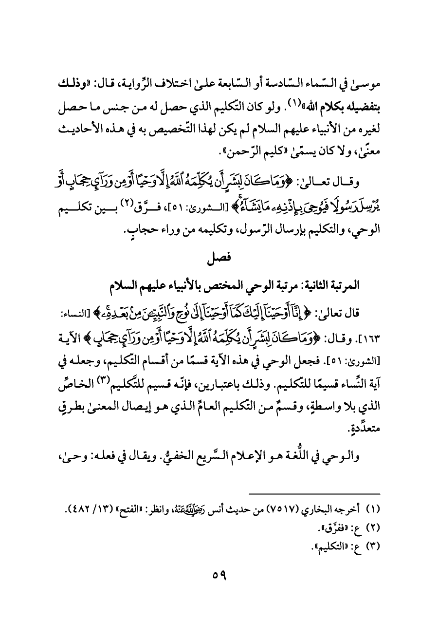قال تعالى: {إِنَّا أَوْحَيْنَا إِلَيْكَ كَمَا أَوْحَيْنَا إِلَى نُوحٍ وَالنَّبِيِّينَ مِنْ بَعْدِهِ} [النساء: ١٦٣]. وقال: {وَمَا كَانَ لِبَشَرٍ أَنْ يُكَلِّمَهُ اللَّهُ إِلَّا وَحْيًا أَوْ مِنْ وَرَاءِ حِجَابٍ} الآية [الشورى: ٥١]. فجعل الوحي في هذه الآية قسمًا من أقسام التّكليم، وجعله في آية النِّساء قسيمًا للتّكليم. وذلك باعتبارين، فإنّه قسيم للتَّكليم (¬٣) الخاصِّ الذي بلا واسطةٍ، وقسمٌ من التّكليم العامِّ الذي هو إيصال المعنى بطرقٍ متعدِّدةٍ.