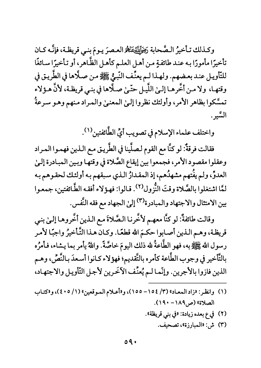 فقالت فرقةٌ: لو كنَّا مع القوم لصلَّينا في الطَّريق مع الذين فهموا المراد وعقلوا مقصود الأمر، فجمعوا بين إيقاع الصَّلاة في وقتها وبين المبادرة إلى العدوِّ، ولم يفُتهم مشهدُهم، إذ المقدارُ الذي سبقهم به أولئك لحقوهم به لمَّا اشتغلوا بالصَّلاة وقتَ النُّزول (¬٢). قالوا: فهؤلاء أفقه الطَّائفتين، جمعوا بين الامتثال والاجتهاد والمبادرة (¬٣) إلى الجهاد مع فقه النَّفس.