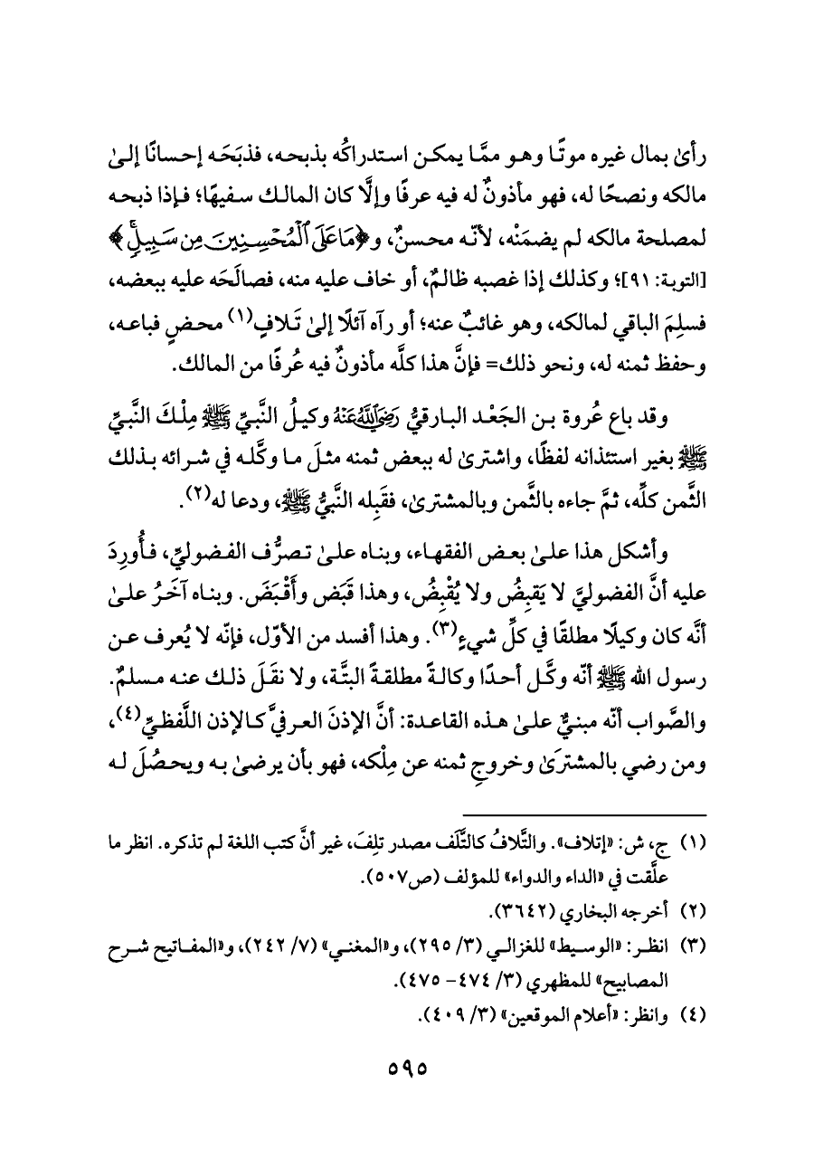 وقد باع عُروة بن الجَعْد البارقيُّ - رضي الله عنه - وكيلُ النَّبيِّ - صلى الله عليه وسلم - مِلْكَ النَّبيِّ - صلى الله عليه وسلم - بغير استئذانه لفظًا، واشترى له ببعض ثمنه مثلَ ما وكَّله في شرائه بذلك الثَّمن كلِّه، ثمَّ جاءه بالثَّمن وبالمشترى، فقَبِله النَّبيُّ - صلى الله عليه وسلم -، ودعا له (¬٢).