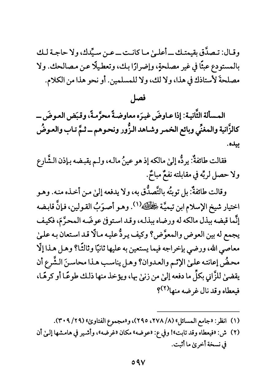 وقالت طائفةٌ: بل توبتُه بالتَّصدُّق به، ولا يدفعه إلى من أخذه منه. وهو اختيار شيخ الإسلام ابن تيميَّة - رحمه الله - (¬١). وهو أصوَبُ القولين، فإنَّ قابضه إنَّما قبضه ببذل مالكه له ورضاه ببذله، وقد استوفى عوضَه المحرَّمَ، فكيف يجمع له بين العوض والمعوَّض؟ وكيف يردُّ عليه مالًا قد استعان به على معاصي الله، ورضي بإخراجه فيما يستعين به عليها ثانيًا وثالثًا؟ وهل هذا إلّا محضُ إعانته على الإثم والعدوان؟ وهل يناسب هذا محاسنَ الشَّرع أن يقضى للزَّاني بكلِّ ما دفعه إلى من زنى بها، ويؤخذ منها ذلك طوعًا أو كرهًا، فيعطاه وقد نال غرضه منها (¬٢)؟