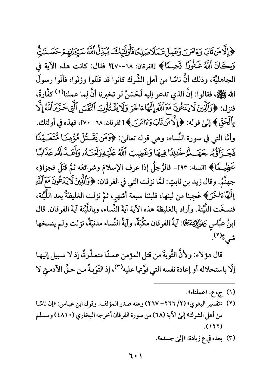 {إِلَّا مَنْ تَابَ وَآمَنَ وَعَمِلَ عَمَلًا صَالِحًا فَأُولَئِكَ يُبَدِّلُ اللَّهُ سَيِّئَاتِهِمْ حَسَنَاتٍ وَكَانَ اللَّهُ غَفُورًا رَحِيمًا} [الفرقان: ٦٨ - ٧٠]؟ فقال: كانت هذه الآية في الجاهليَّة، وذلك أنَّ ناسًا من أهل الشِّرك كانوا قد قتَلوا وزنَوا، فأتَوا رسولَ الله - صلى الله عليه وسلم -، فقالوا: إنَّ الذي تدعو إليه لَحَسَنٌ لو تخبرنا أنَّ لِما عملنا (¬١) كفَّارةً، فنزل: {وَالَّذِينَ لَا يَدْعُونَ مَعَ اللَّهِ إِلَهًا آخَرَ وَلَا يَقْتُلُونَ النَّفْسَ الَّتِي حَرَّمَ اللَّهُ إِلَّا بِالْحَقِّ} إلى قوله: {إِلَّا مَنْ تَابَ وَآمَنَ} [الفرقان: ٦٨ - ٧٠]، فهذه في أولئك. وأمَّا التي في سورة النِّساء، وهي قوله تعالى: {وَمَنْ يَقْتُلْ مُؤْمِنًا مُتَعَمِّدًا فَجَزَاؤُهُ جَهَنَّمُ خَالِدًا فِيهَا وَغَضِبَ اللَّهُ عَلَيْهِ وَلَعَنَهُ وَأَعَدَّ لَهُ عَذَابًا عَظِيمًا} [النساء: ٩٣] = فالرَّجلُ إذا عرف الإسلامَ وشرائعَه ثمَّ قتَلَ فجزاؤه جهنَّمُ. وقال زيد بن ثابتٍ: لمَّا نزلت التي في الفرقان: {وَالَّذِينَ لَا يَدْعُونَ مَعَ اللَّهِ إِلَهًا آخَرَ} عَجِبنا من لينها، فلبثنا سبعة أشهرٍ، ثمَّ نزلت الغليظةُ بعد اللَّيِّنة، فنسخَت اللَّيِّنةَ. وأراد بالغليظة هذه الآية آيةَ النِّساء، وباللَّيِّنة آيةَ الفرقان. قال ابنُ عبَّاسٍ - رضي الله عنهما -: آيةُ الفرقان مكِّيّةٌ، وآيةُ النِّساء مدنيّةٌ، نزلت ولم ينسخها شيءٌ (¬٢).