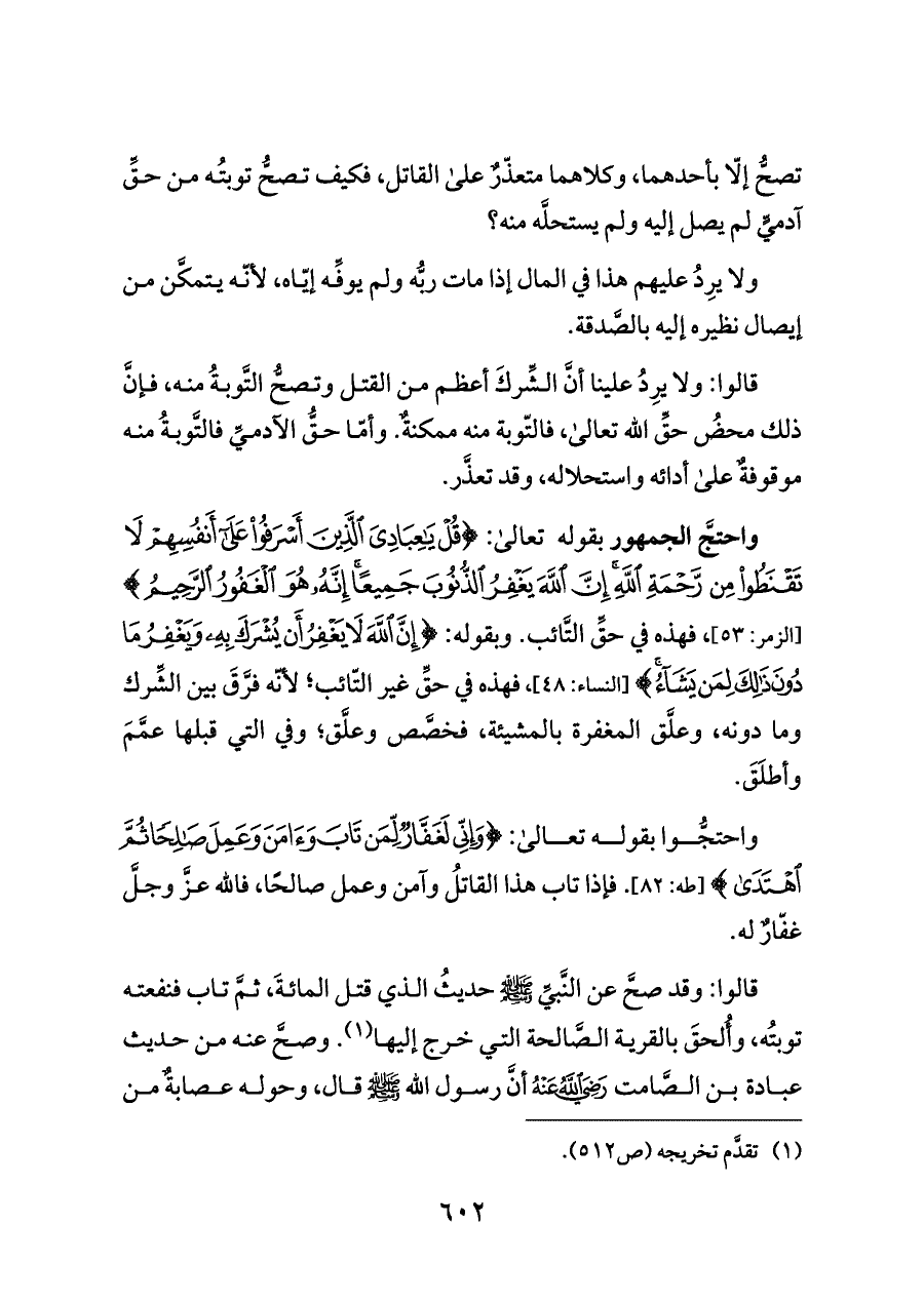 قالوا: وقد صحَّ عن النَّبيِّ - صلى الله عليه وسلم - حديثُ الذي قتل المائةَ، ثمَّ تاب فنفعته توبتُه، وأُلحقَ بالقرية الصَّالحة التي خرج إليها (¬١). وصحَّ عنه من حديث عبادة بن الصَّامت - رضي الله عنه - أنَّ رسول الله - صلى الله عليه وسلم - قال، وحوله عصابةٌ من