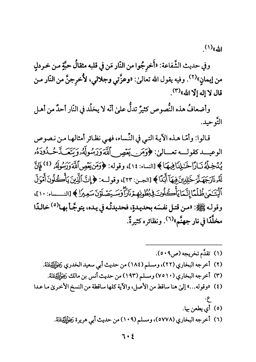 قالوا: وأمّا هذه الآية التي في النِّساء، فهي نظائر أمثالها من نصوص الوعيد كقوله تعالى: {وَمَنْ يَعْصِ اللَّهَ وَرَسُولَهُ وَيَتَعَدَّ حُدُودَهُ يُدْخِلْهُ نَارًا خَالِدًا فِيهَا} [النساء: ١٤]، وقوله: {وَمَنْ يَعْصِ اللَّهَ وَرَسُولَهُ (¬٤) فَإِنَّ لَهُ نَارَ جَهَنَّمَ خَالِدِينَ فِيهَا أَبَدًا} [الجن: ٢٣]، وقوله: {إِنَّ الَّذِينَ يَأْكُلُونَ أَمْوَالَ الْيَتَامَى ظُلْمًا إِنَّمَا يَأْكُلُونَ فِي بُطُونِهِمْ نَارًا وَسَيَصْلَوْنَ سَعِيرًا} [النساء: ١٠]، وقوله - صلى الله عليه وسلم -: "من قتل نفسَه بحديدةٍ، فحديدتُه في يده، يتوجَّأ بها (¬٥) خالدًا مخلَّدًا في نار جهنَّم" (¬٦). ونظائره كثيرةٌ.