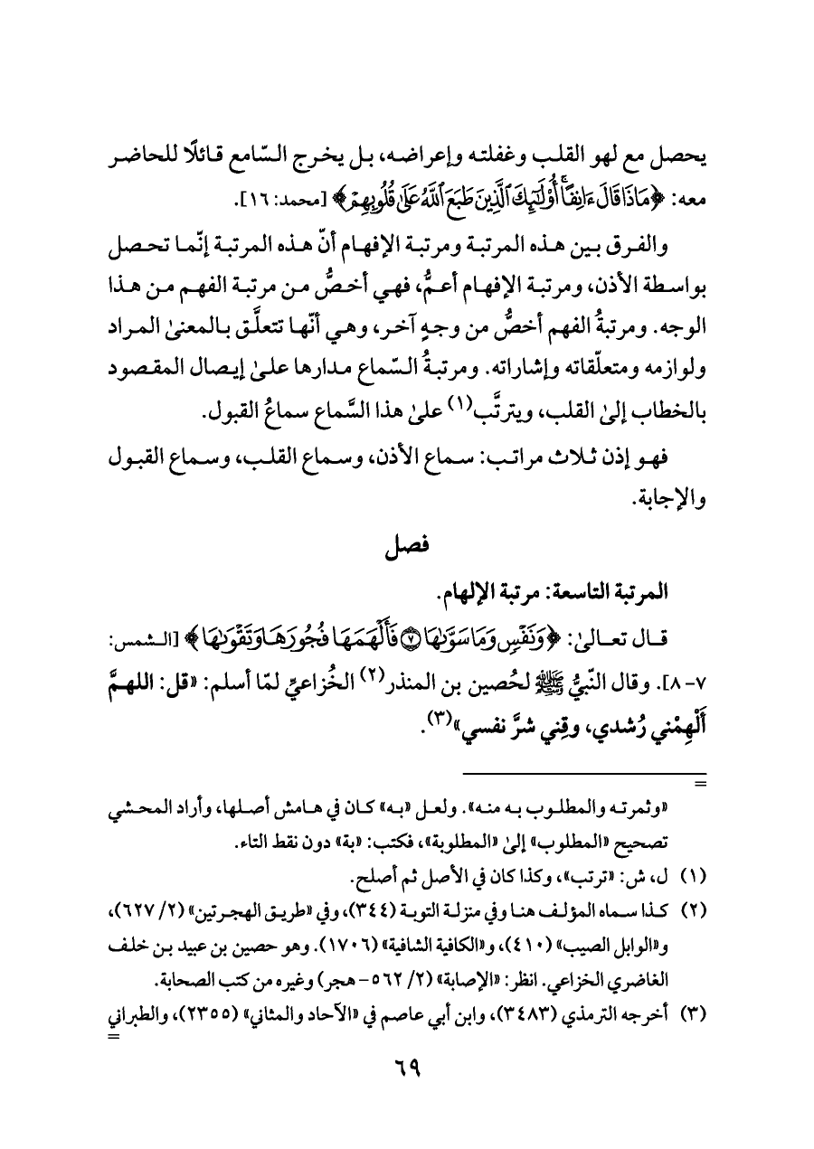 قال تعالى: {وَنَفْسٍ وَمَا سَوَّاهَا (٧) فَأَلْهَمَهَا فُجُورَهَا وَتَقْوَاهَا} [الشمس: ٧ - ٨]. وقال النّبيُّ - صلى الله عليه وسلم - لحُصين بن المنذر (¬٢) الخُزاعيِّ لمّا أسلم: "قل: اللهمَّ أَلْهِمْني رُشدي، وقِني شرَّ نفسي" (¬٣).