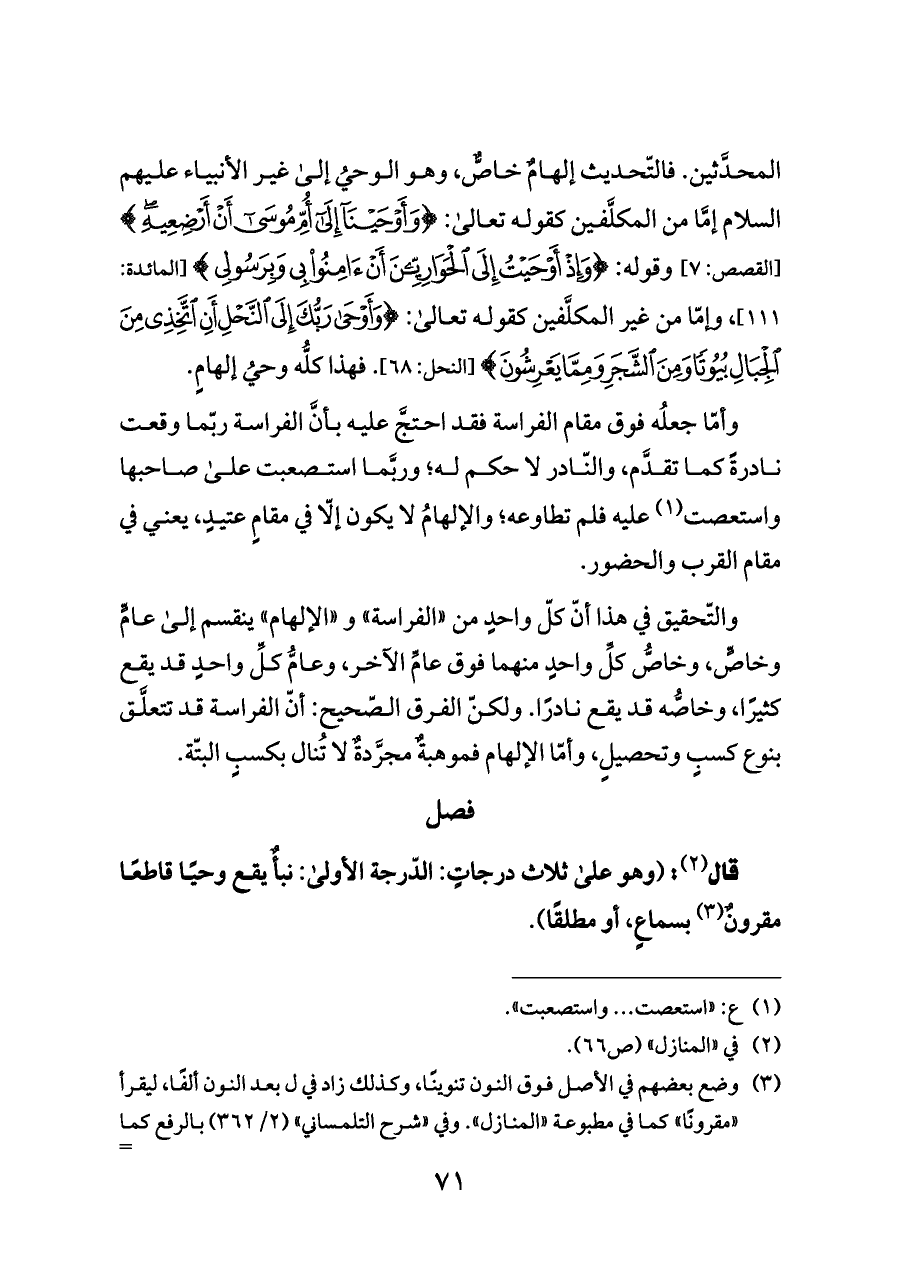 وأمّا جعلُه فوق مقام الفراسة فقد احتجَّ عليه بأنَّ الفراسة ربّما وقعت نادرةً كما تقدَّم، والنّادر لا حكم له؛ وربَّما استصعبت على صاحبها واستعصت (¬١) عليه فلم تطاوعه؛ والإلهامُ لا يكون إلّا في مقامٍ عتيدٍ، يعني في مقام القرب والحضور.