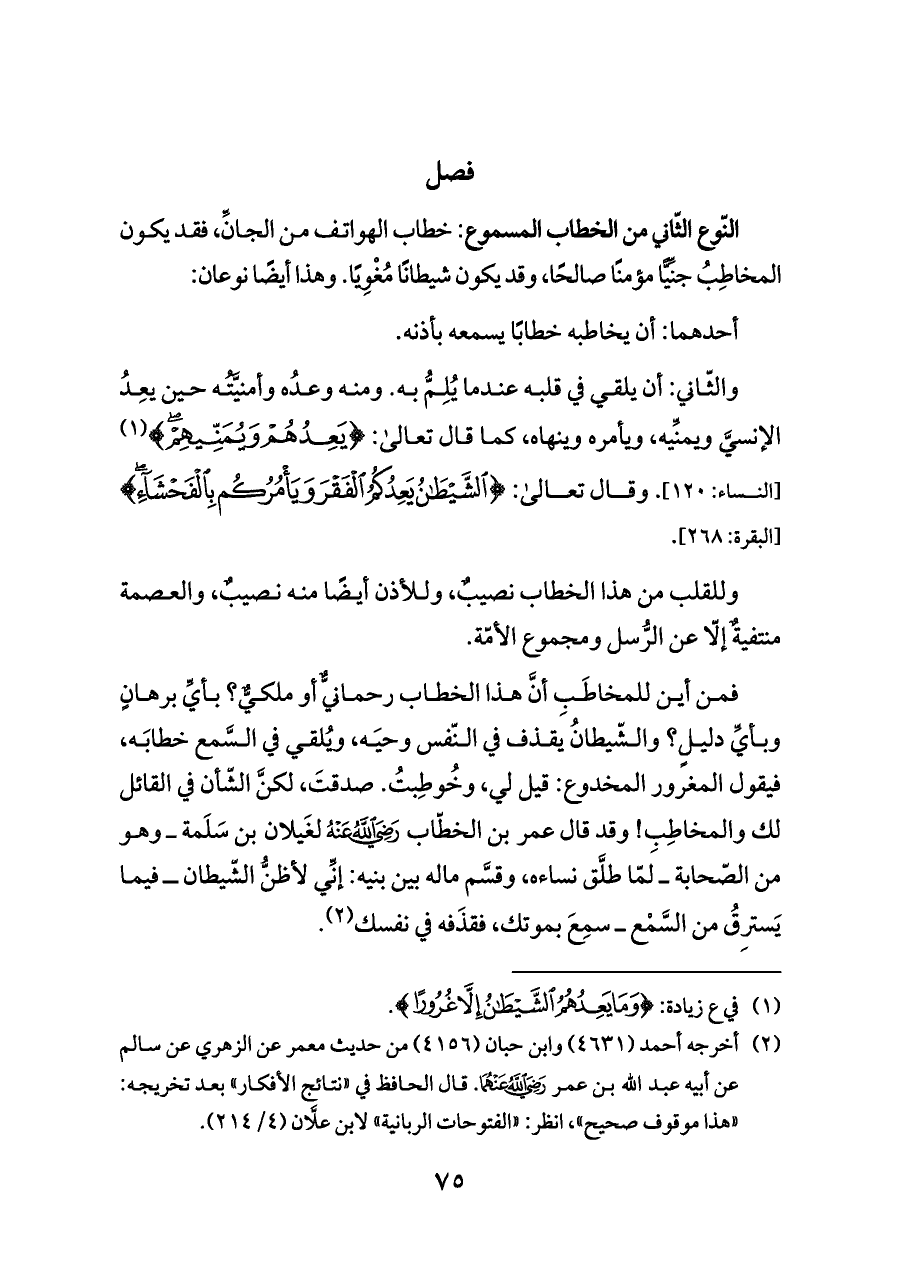 فمن أين للمخاطَبِ أنَّ هذا الخطاب رحمانيٌّ أو ملكيٌّ؟ بأيِّ برهانٍ وبأيِّ دليلٍ؟ والشّيطانُ يقذف في النّفس وحيَه، ويُلقي في السَّمع خطابَه، فيقول المغرور المخدوع: قيل لي، وخُوطِبتُ. صدقتَ، لكنَّ الشّأن في القائل لك والمخاطِبِ! وقد قال عمر بن الخطّاب - رضي الله عنه - لغَيلان بن سَلَمة ــ وهو من الصّحابة ــ لمّا طلَّق نساءه، وقسَّم ماله بين بنيه: إنِّي لأظنُّ الشّيطان ــ فيما يَسترِقُ من السَّمْع ــ سمِعَ بموتك، فقذَفه في نفسك (¬٢).