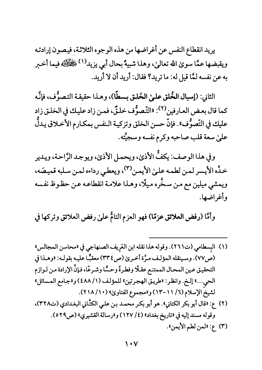 يريد انقطاع النفس عن أغراضها من هذه الوجوه الثلاثة، فيصون إرادته ويقبضها عمَّا سوى الله تعالى، وهذا شبيهٌ بحال أبي يزيد (¬١) - رحمه الله - فيما أخبر به عن نفسه لمَّا قيل له: ما تريد؟ فقال: أريد أن لا أريد.