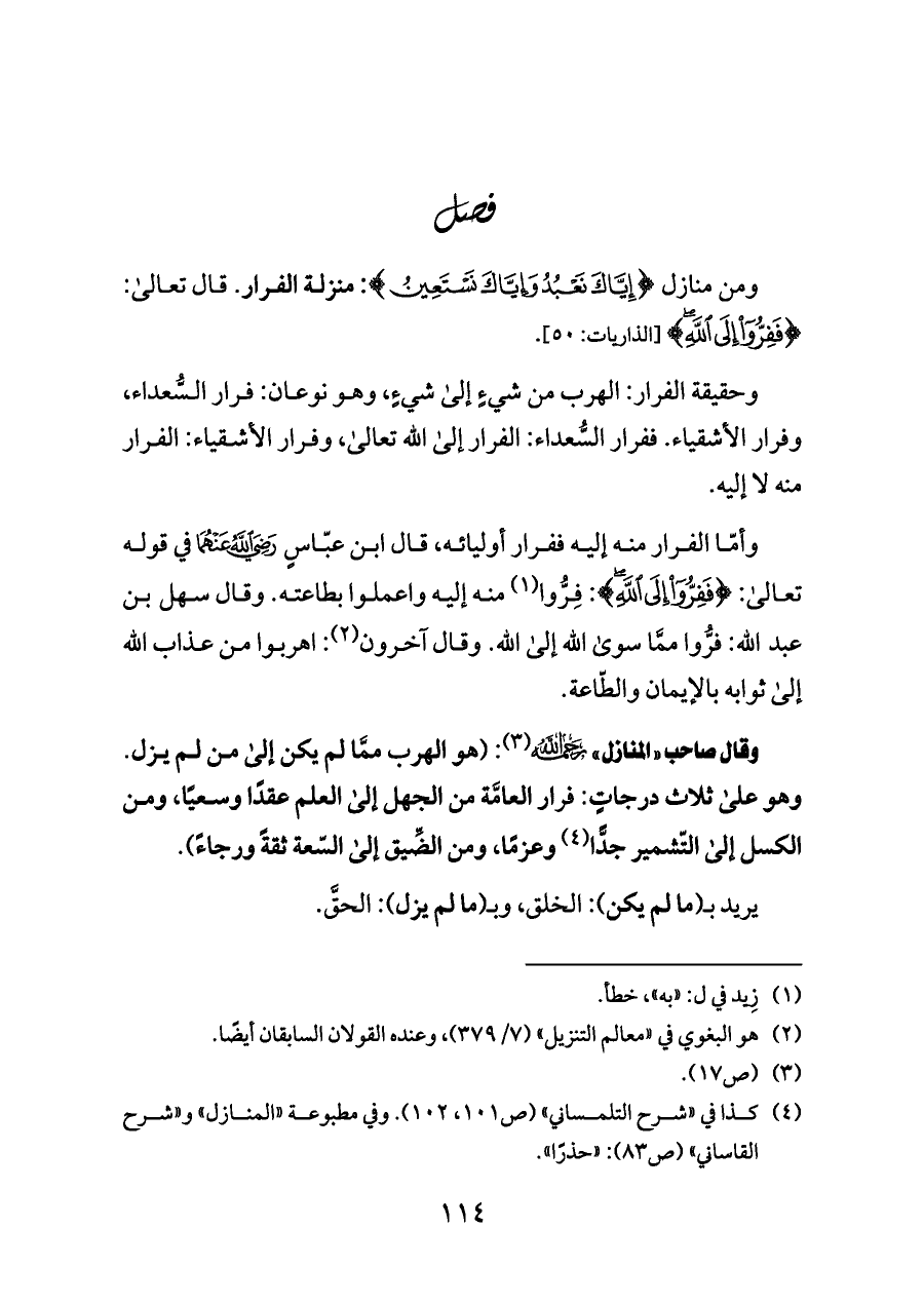 ومن منازل {إِيَّاكَ نَعْبُدُ وَإِيَّاكَ نَسْتَعِينُ}: منزلة الفرار. قال تعالى: {فَفِرُّوا إِلَى اللَّهِ} [الذاريات: ٥٠].