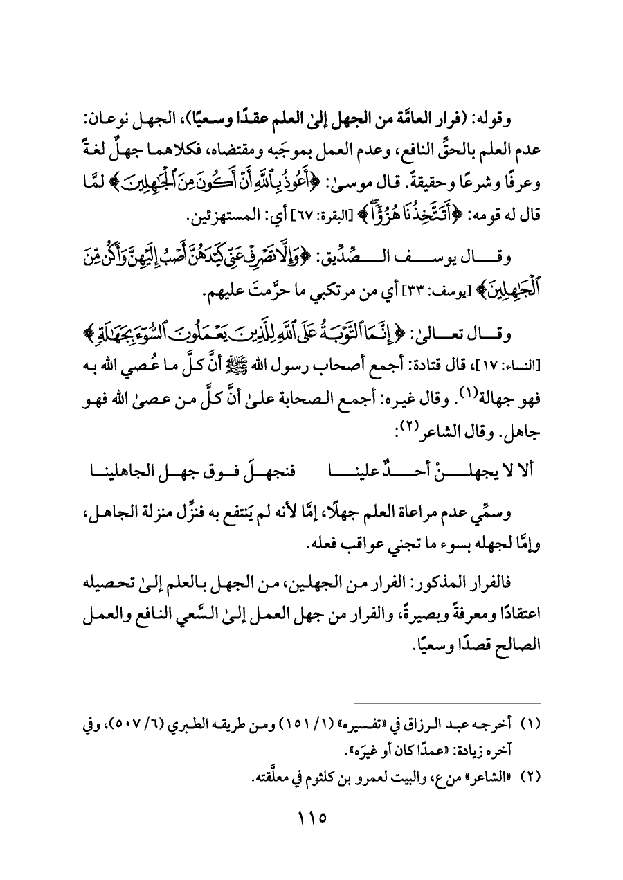 وقوله: (فرار العامَّة من الجهل إلى العلم عقدًا وسعيًا)، الجهل نوعان: عدم العلم بالحقِّ النافع، وعدم العمل بموجَبه ومقتضاه، فكلاهما جهلٌ لغةً وعرفًا وشرعًا وحقيقةً. قال موسى: {أَعُوذُ بِاللَّهِ أَنْ أَكُونَ مِنَ الْجَاهِلِينَ} لمَّا قال له قومه: {أَتَتَّخِذُنَا هُزُؤًا} [البقرة: ٦٧] أي: المستهزئين.