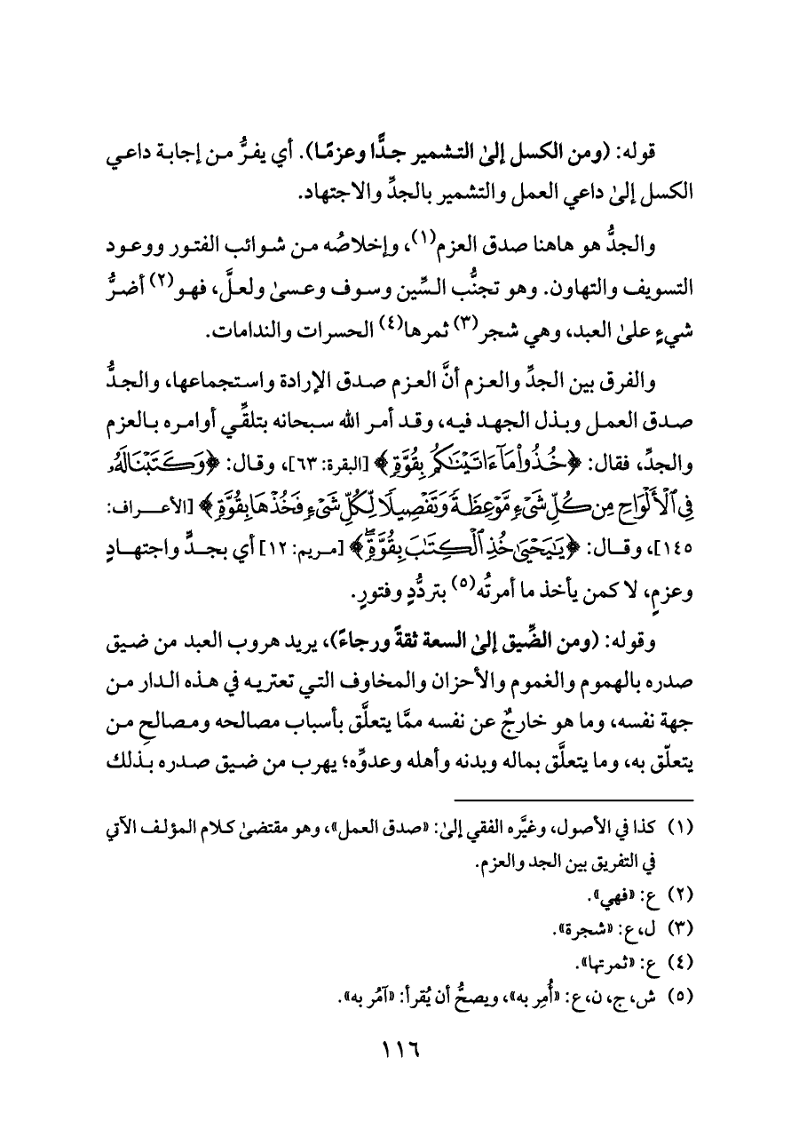 والفرق بين الجدِّ والعزم أنَّ العزم صدق الإرادة واستجماعها، والجدُّ صدق العمل وبذل الجهد فيه، وقد أمر الله سبحانه بتلقِّي أوامره بالعزم والجدِّ، فقال: {خُذُوا مَا آتَيْنَاكُمْ بِقُوَّةٍ} [البقرة: ٦٣]، وقال: {وَكَتَبْنَا لَهُ فِي الْأَلْوَاحِ مِنْ كُلِّ شَيْءٍ مَوْعِظَةً وَتَفْصِيلًا لِكُلِّ شَيْءٍ فَخُذْهَا بِقُوَّةٍ} [الأعراف: ١٤٥]، وقال: {يَايَحْيَى خُذِ الْكِتَابَ بِقُوَّةٍ} [مريم: ١٢] أي بجدٍّ واجتهادٍ وعزمٍ، لا كمن يأخذ ما أمرتُه (¬٥) بتردُّدٍ وفتورٍ.