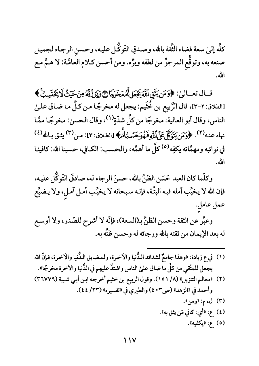 قال تعالى: {وَمَنْ يَتَّقِ اللَّهَ يَجْعَلْ لَهُ مَخْرَجًا (٢) وَيَرْزُقْهُ مِنْ حَيْثُ لَا يَحْتَسِبُ} [الطلاق: ٢ - ٣]، قال الرَّبيع بن خُثَيم: يجعل له مخرجًا من كلِّ ما ضاق على الناس، وقال أبو العالية: مخرجًا من كلِّ شدّةٍ (¬١)، وقال الحسن: مخرجًا ممَّا نهاه عنه (¬٢). {وَمَنْ يَتَوَكَّلْ عَلَى اللَّهِ فَهُوَ حَسْبُهُ} [الطلاق: ٣]: من (¬٣) يثق بالله (¬٤) في نوائبه ومهمَّاته يكفِه (¬٥) كلَّ ما أهمَّه، والحسب: الكافي، حسبنا الله: كافينا الله.