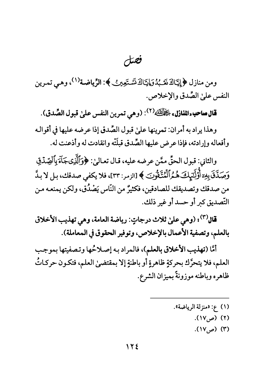 ومن منازل {إِيَّاكَ نَعْبُدُ وَإِيَّاكَ نَسْتَعِينُ}: الرِّياضة (¬١)، وهي تمرين النفس على الصِّدق والإخلاص.